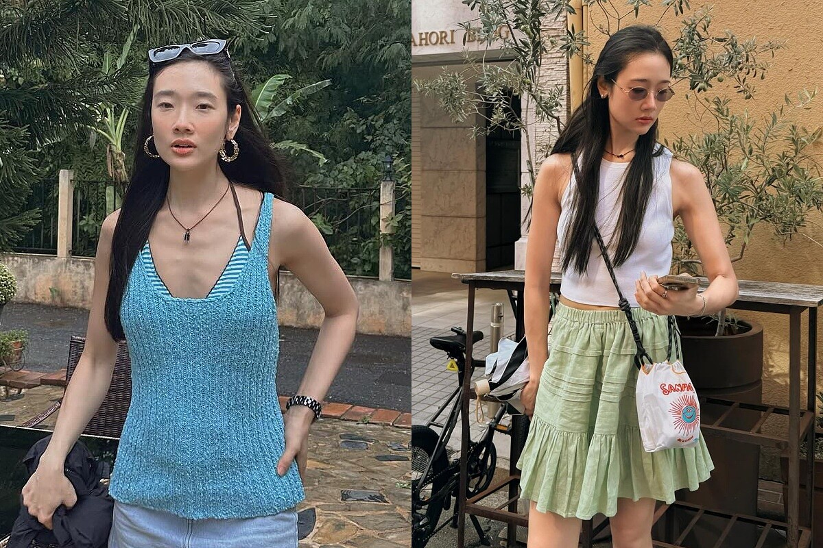 Aokbab的穿搭核心很「簡單」,通常會以白、淺藍、薄荷綠等輕盈色系為主,搭配丹寧或基本款單品,展現乾淨透氣的氛圍,不論是夏日小背心,還是印花短洋裝,都保有一種Eeffortless的清爽感。