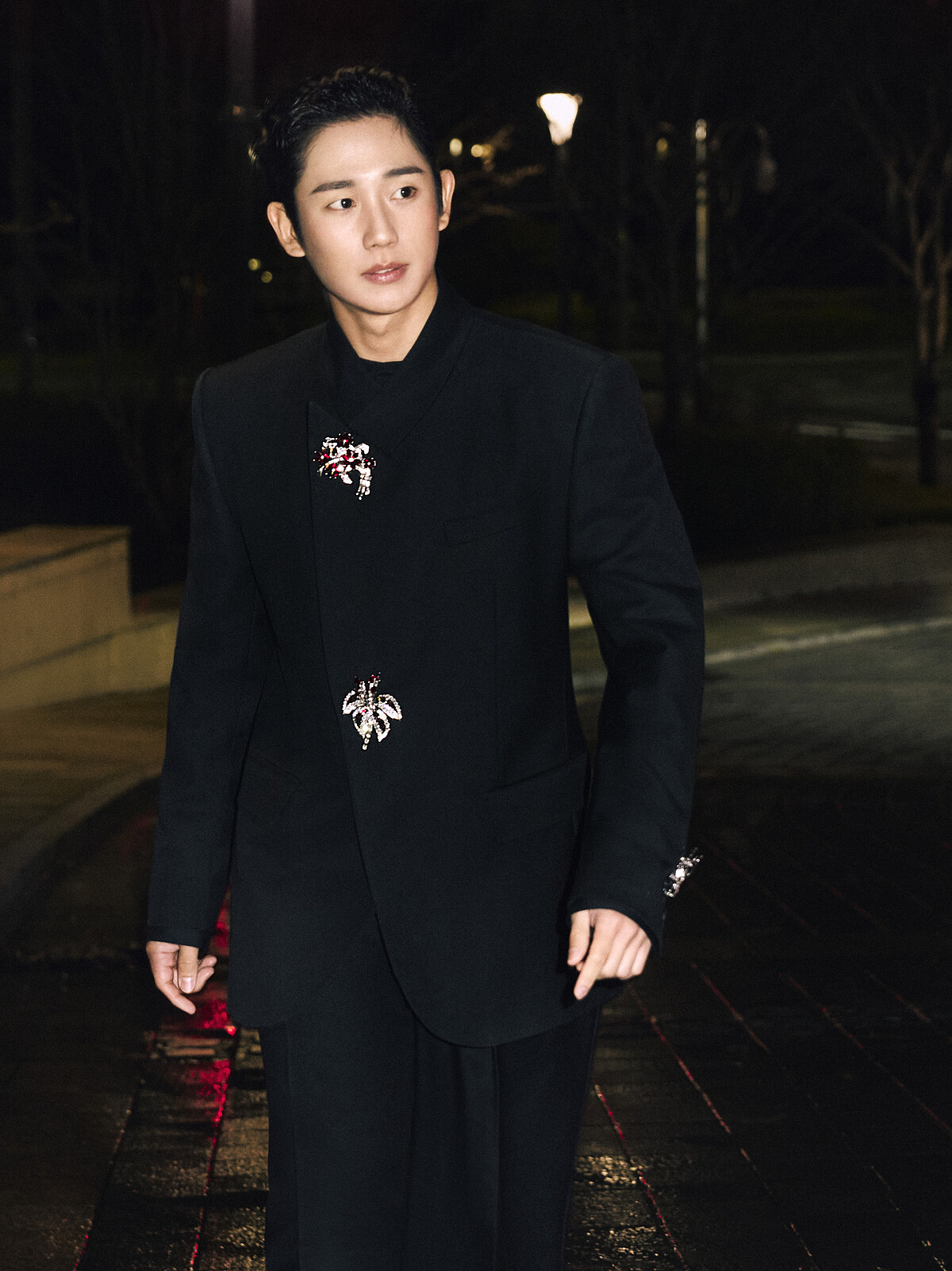 劍領設計突顯肩線力量也能修飾臉型,搭配細緻格紋,融合經典與現代,丁海寅彰顯沉穩紳士的自信姿態,俐落又精緻。