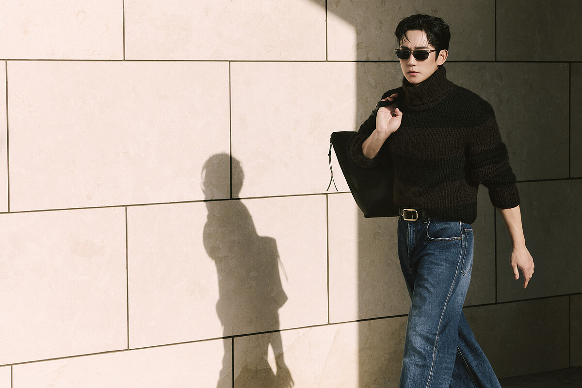 深色高領針織衫搭配丹寧褲不是賈伯斯的專利,當舒適針織與丹寧相遇,除了能夠營造放鬆氛圍,也適合閒暇時刻,讓丁海寅依舊保持明星般的自在氣質。