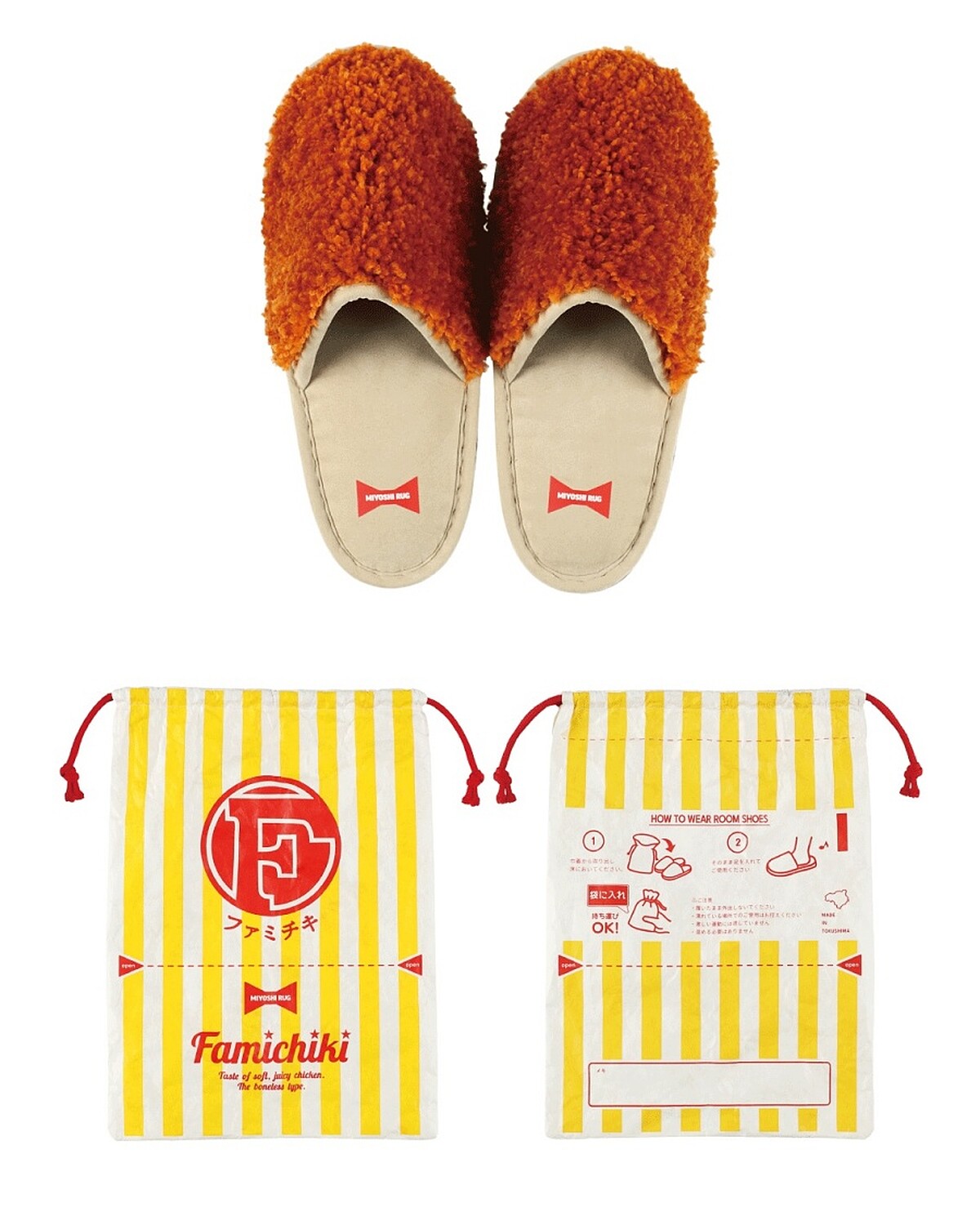 你是去日本就必吃全家炸雞的人嗎?如果你是,那這雙日本全家FamilyMart與生活品牌Miyoshi Rug合作推出的「炸雞拖鞋」絕對會讓你尖叫,鞋面用了毛絨布料去模擬炸雞酥脆的外皮,顏色更是帶點焦糖感的濃金黃,看起來就像剛炸好的香嫩雞排,還搭配了黃白條紋的專屬收納袋,就像你提著剛買好的炸雞回家一樣,幽默實用都滿分。
