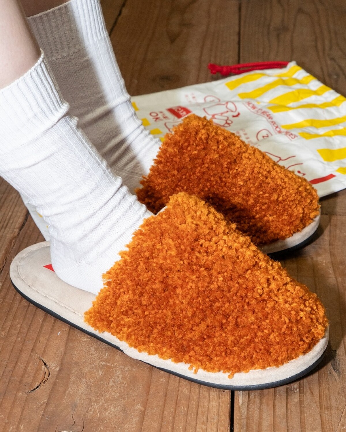 這雙「炸雞拖鞋」的鞋面以立體毛絨布料呈現,乍看就像覆上一層厚實的金黃炸雞皮,鬆軟中帶點酥脆的錯覺,光看就讓人食指大動,鞋底部分則加入柔軟厚墊,踩起來輕盈又舒適。