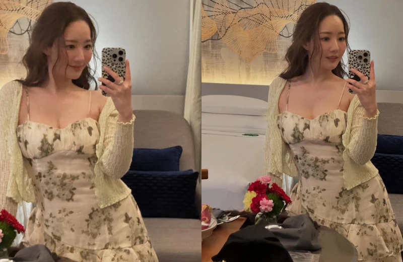 針織外套搭配碎花洋裝的穿搭法可以說是朴敏英的「不敗經典」穿搭代表,同樣選擇淺色系單品來襯托好氣色,微捲的公主頭造型更適合出席聚會或是半正式的活動,細肩帶的馬甲款式替她增添了不少性感氛圍,甜美中又帶有氣質,論誰看了都很難抵擋得住這股清純魅力。