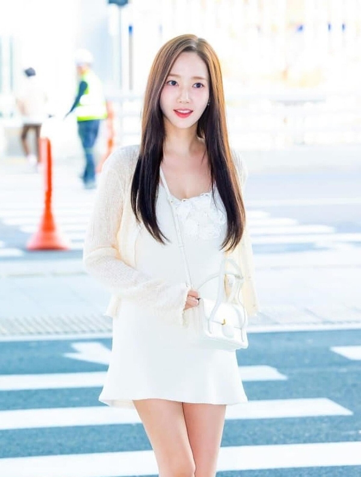 朴敏英的機場照從未失誤過,這套「人間白月光」的造型完全讓她自帶光芒,「淺色搭配淺色」的公式很好地襯托出女性的優雅和氣質,外搭選擇舒適親膚的薄針織外套,柔軟的面料更顯好感,洋裝則是選擇A字版型來營造修身效果,沒有過多的飾品點綴也能看起來閃耀動人。