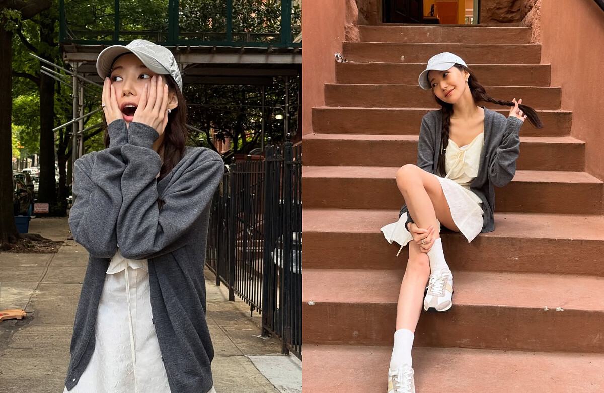 小洋裝也能穿出休閒的氛圍,朴敏英將版型簡單的針織外套當作整體穿搭的主角,灰色本身就帶有俐落和知性的感覺,再將它和甜美的短洋裝以及和球鞋兩種風格迥異的單品搭配在一起,除了展現好衣品之外,還能散發不經意的鬆弛感,想再看起來更減齡,棒球帽、帆布包或是辮子造型都是能畫龍點睛的秘訣!