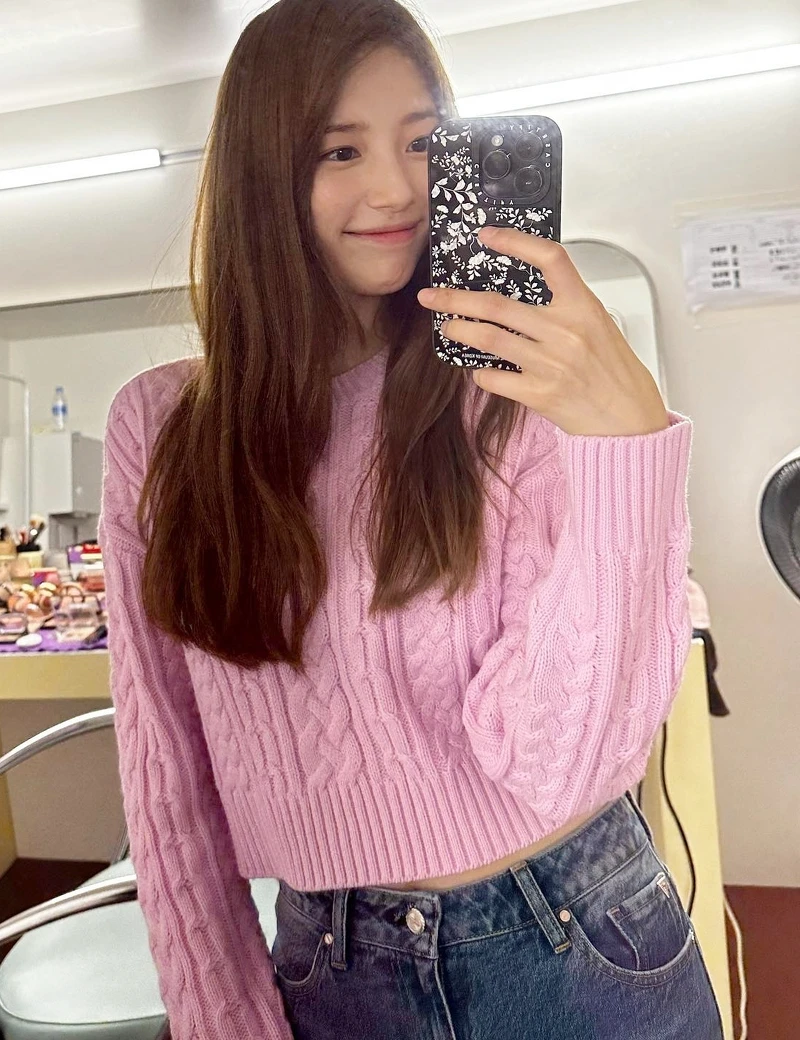 粉紅是秀智的拿手色系,她選擇短版針織上衣搭配高腰牛仔褲,這樣既能拉長比例又不失可愛感,上衣的粗針編織紋理讓造型更有層次感,粉色系更像是自帶的戀愛濾鏡,是秋冬想提升溫柔氛圍的首選單品。