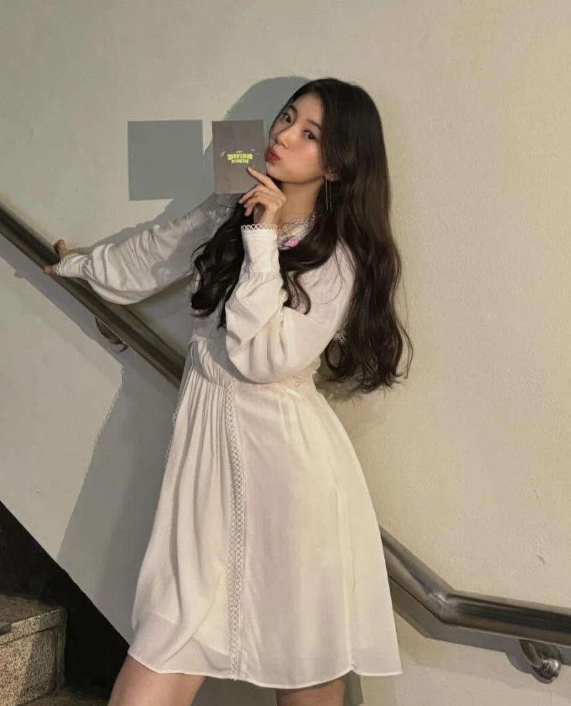 一秒化身「初戀本人」!白洋裝是秀智式氣質的代表,這套細緻的蕾絲滾邊高腰洋裝,搭配自然微捲的長髮與淡妝,整體乾淨、柔美又不過分甜,這類白色洋裝能完美詮釋「純淨清新」的氣質,是任何季節都能駕馭的浪漫單品。