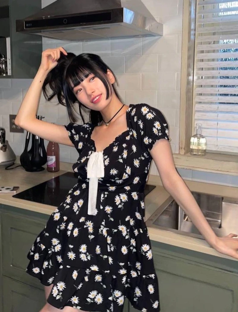 白月光不一定只能穿白色!這套黑底雛菊洋裝,透過胸前綁帶蝴蝶結的細節,讓秀智的穿搭帶有微復古的浪漫氣息,讓整體既有少女感又不會太過稚氣,而是多了一份法式柔媚感,這種穿法特別適合約會或下午茶時光!