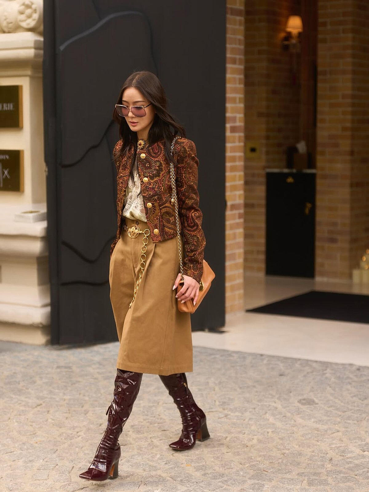 孫芸芸穿著粉色蕾絲拼接夾克外套,搭配透視黑色長裙,一派愜意走進巴黎的陽光街道,巨大的金屬扣腰帶令優雅造型展現狂放一面。手中的Paddington鎖頭包,則是曾風靡千禧世代的經典款再造,20年後的今日,Paddington再度走上時尚前線。