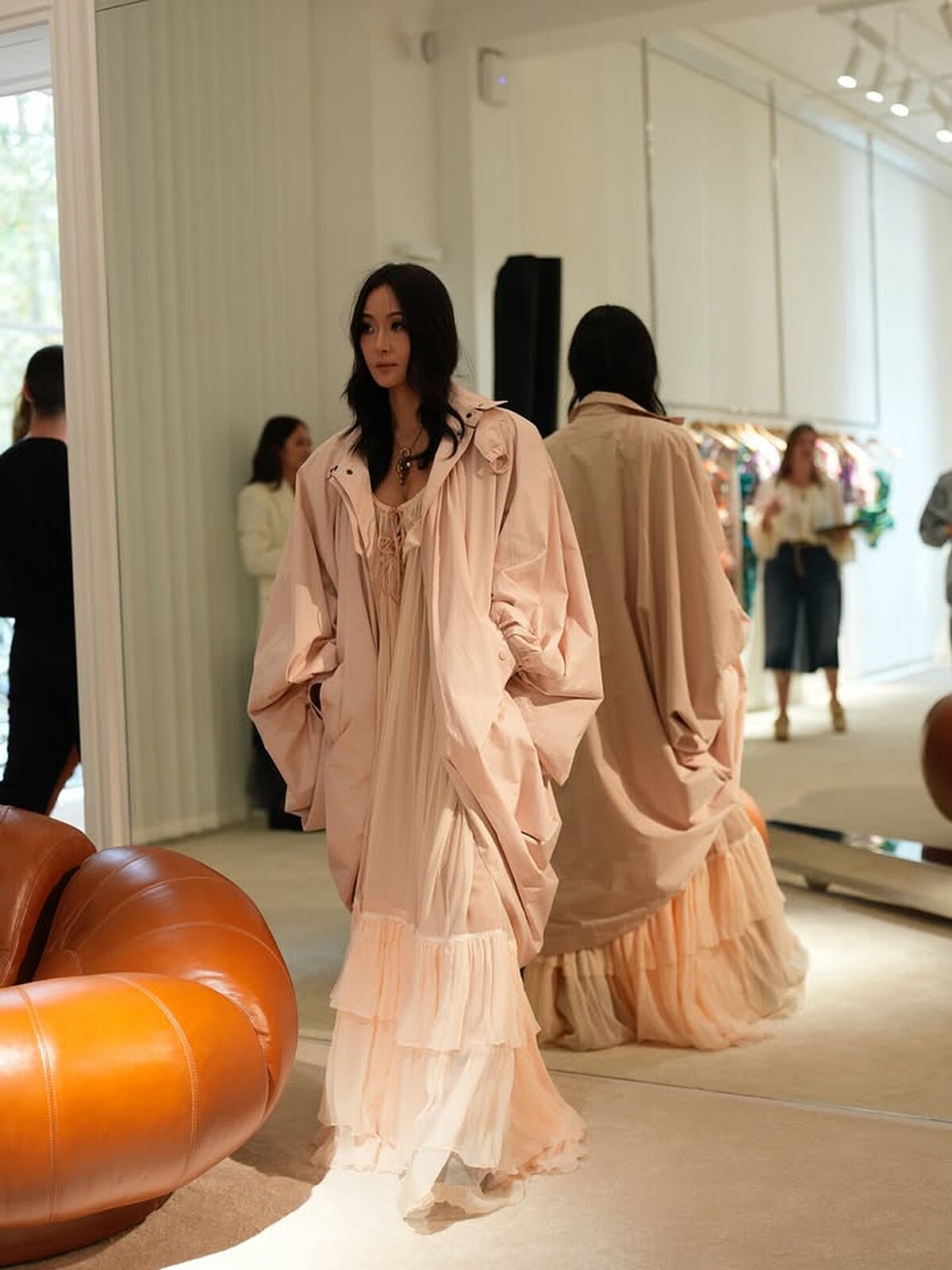 最後一套孫芸芸一襲輕盈飄然的洋裝現身Chloé展示間,波西米亞風標誌性的荷葉邊、蕾絲元素與垂墜剪裁,盡顯仙女般的氣質,尤其是那通透的透明感,極美!而Paddington手袋於如此仙氣的造型裡也同樣百搭。