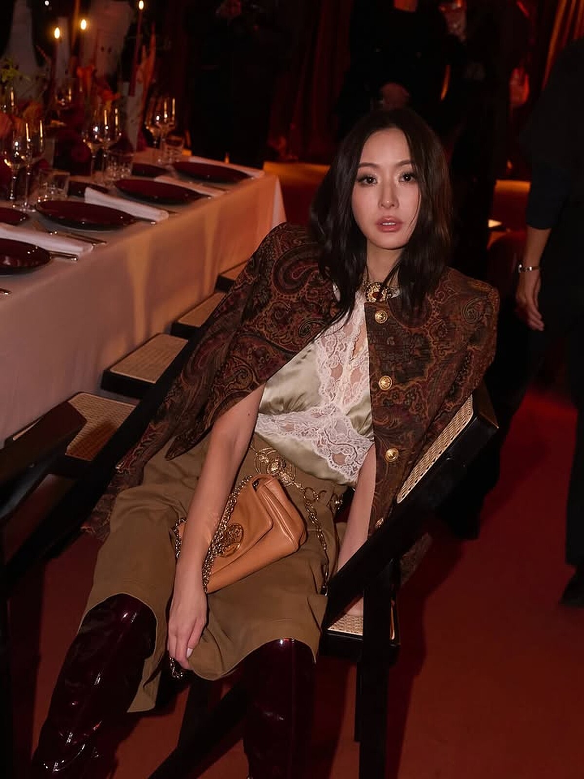 平時常走簡約高雅路線的孫芸芸,這回參加Chloé 2026春夏大秀選擇了一套品牌經典方正輪廓的無領夾克,以佩斯利掛毯提花與金屬扣飾點綴,配上率性的五分褲、靴子造型,是孫芸芸少有的風格,讓她也覺得非常新鮮、很喜歡。