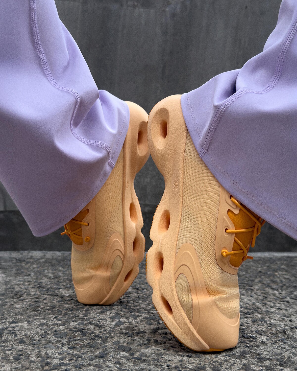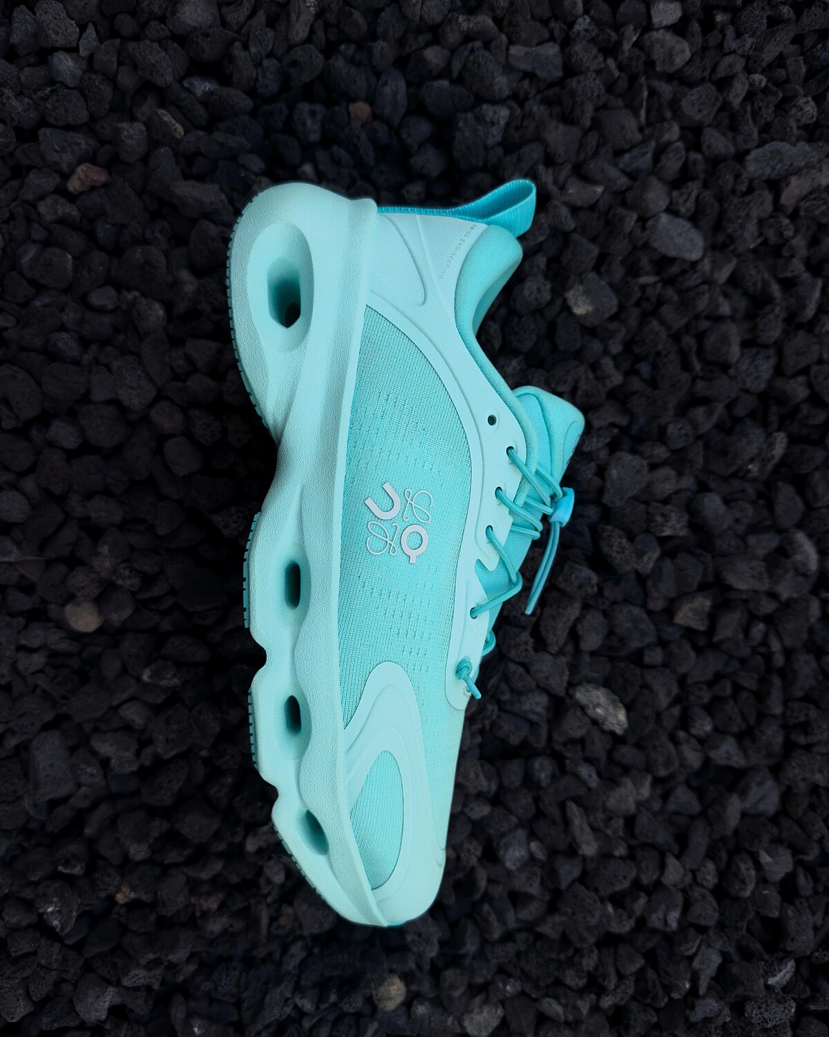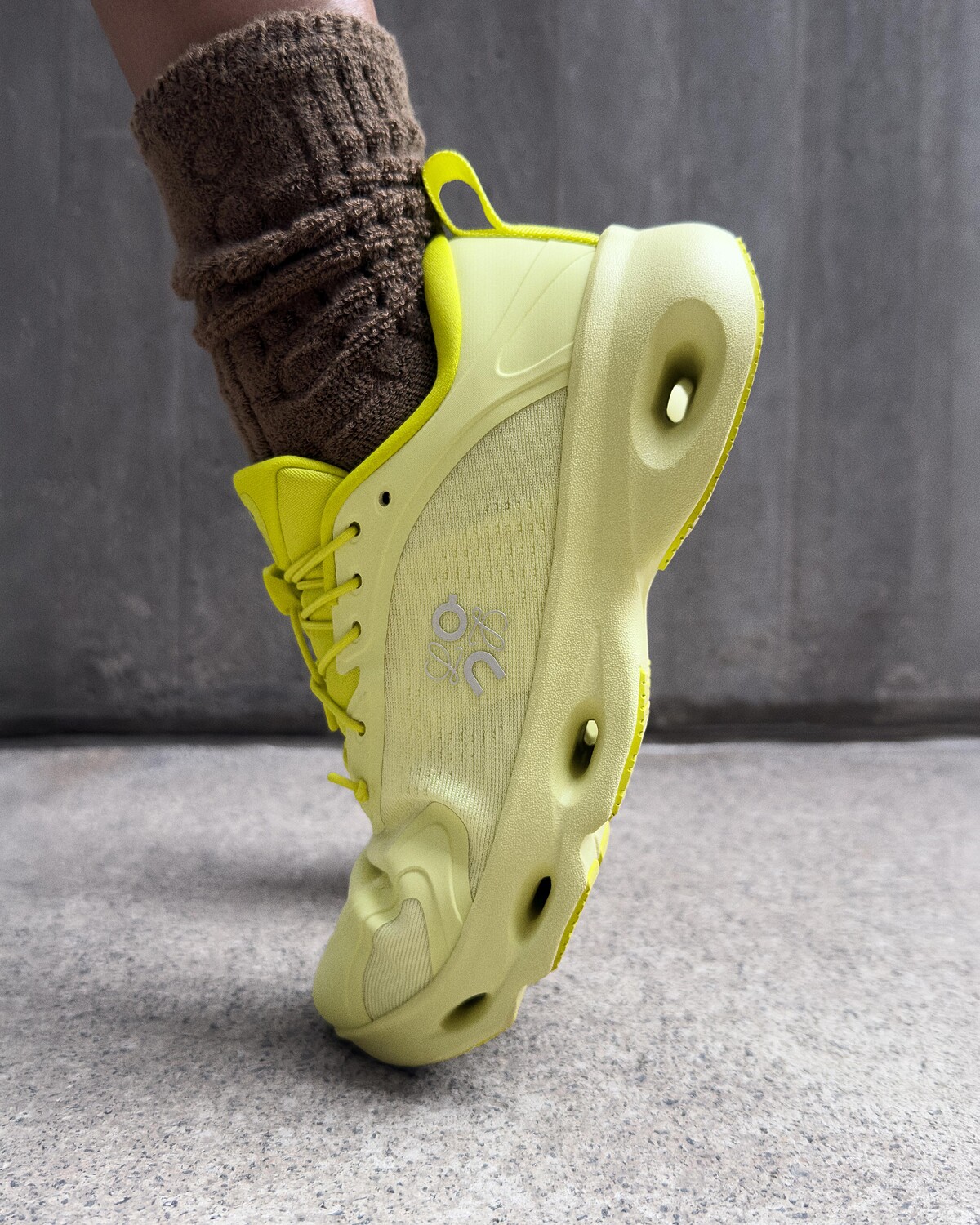 先前雙方的聯名通常以On現有的人氣鞋型為核心改造,不過新一季聯名嶄新的鞋款「Cloudsolo」誕生了,從名稱可以得知,其依然採用了On的Cloud雲朵緩震機能,不過鞋跟位置縮減到只有一個洞(CloudTec®緩震結構),中底以Helion™ 超級泡沫及專利Speedboard構成,鞋面為On研製的功能型半透明織網,配上Loewe Anogram標誌石卵形鞋帶扣,以及可調節彈性鞋帶,鞋側則點綴雙方聯名標誌,總共帶來綠松石色、橙色、青檸綠色及多個中性色調可選擇。