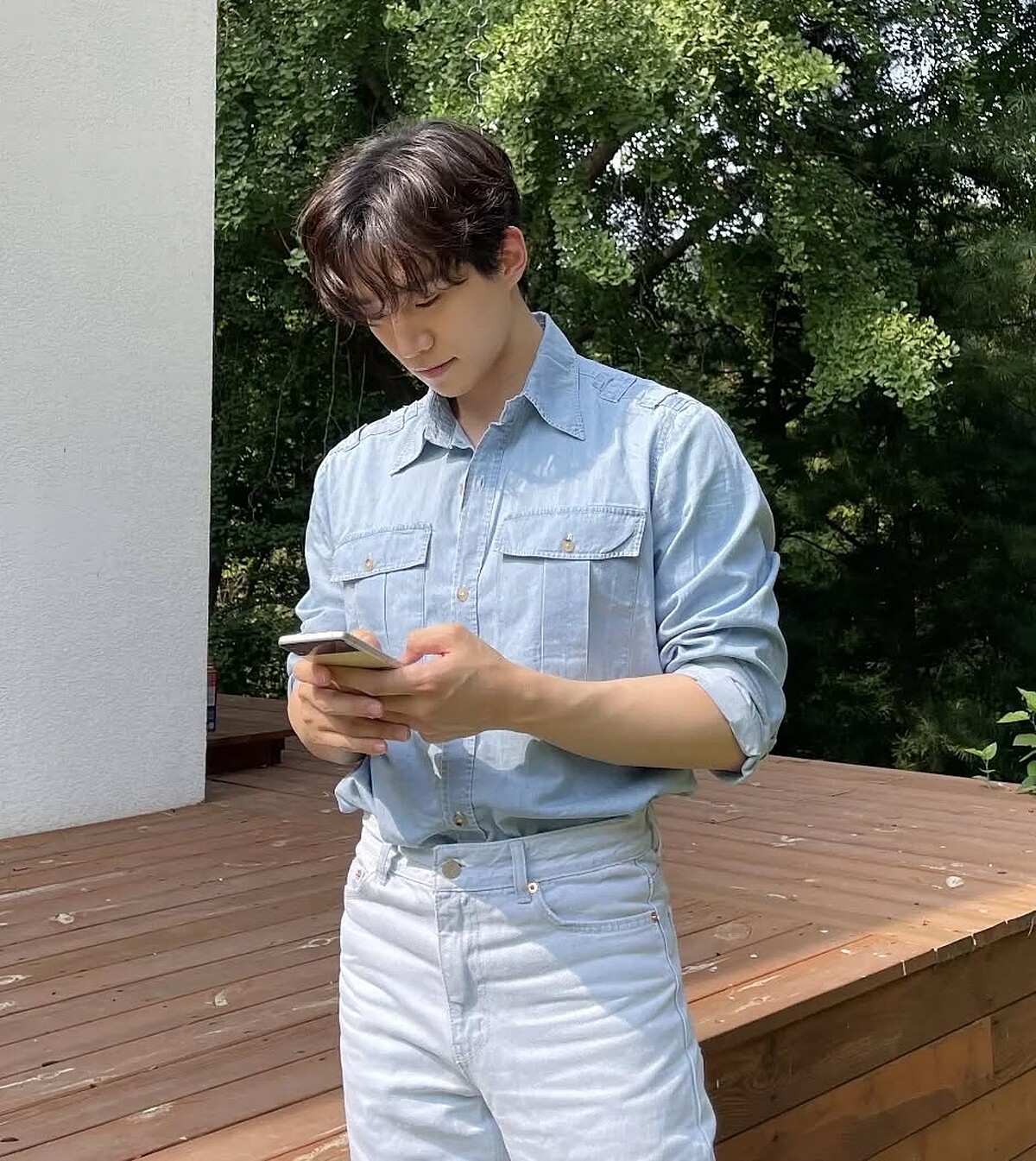 成套的丹寧穿搭有時會顯得太過厚重,這時候可以跟李俊昊一樣選擇淡藍色系的丹寧單品組合,像是李俊昊在這套穿搭中,上下身都是稍微合身的版型,襯衫微紮進褲頭、袖口隨興捲起,比例立刻拉長,看起來有一中自在的隨性,而這種類型的同色系疊穿,無論是日常獲釋週末出遊都蠻適合!