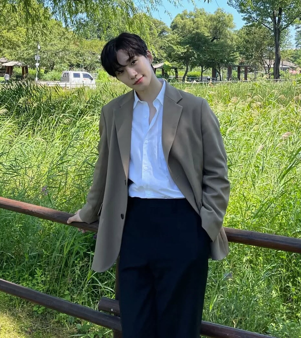 白襯衫常常會讓人有一種正式感,不過李俊昊選擇搭配上寬鬆的駝色外套,下身搭配深色西裝褲,而微開的領口與不刻意收緊的下擺,讓正式中帶有生活感,也是既紳士又不會太過嚴肅的組合。
