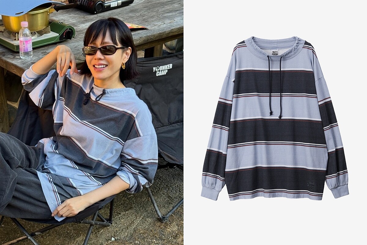 孫藝珍在這套露營穿搭中,穿著Oversized的條紋抽繩上衣,搭配絨面休閒長褲,而這件條紋上衣則是來自韓國古著選品店ÉCRU推出的系列單品之一,在主打男女皆可穿的Unisex風格與復古美學的設計感之下,這件條紋上衣有著洗舊的質感,搭配上寬窄搭配的條紋色塊設計,頗有復古的美式休閒氛圍,在孫藝珍穿上後,品牌官網的同色系款式也光速售罄。