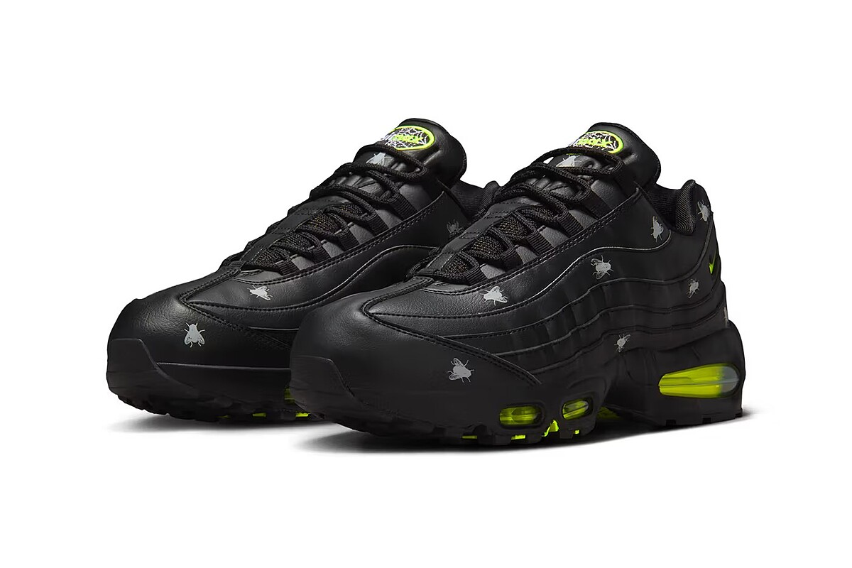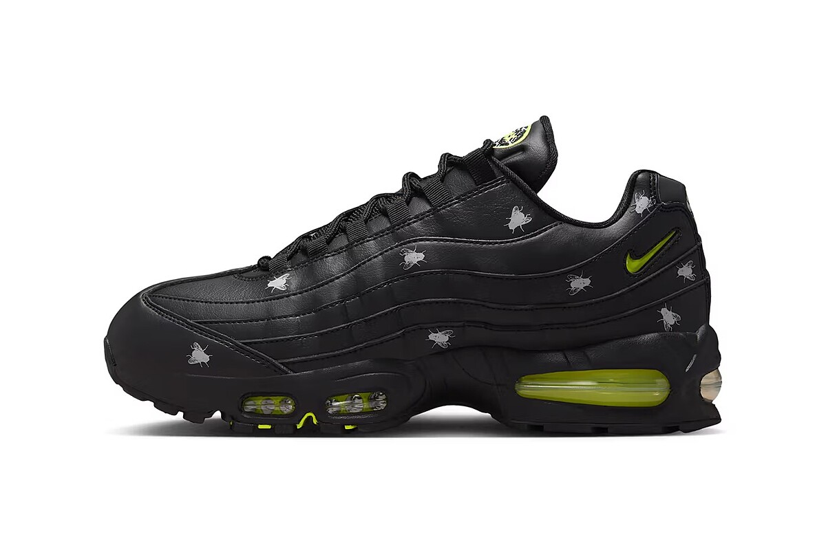 萬聖節來臨,Nike 的「Halloween Pack」總是焦點。今年的 Air Max 95「Houseflies」以陰鬱黑色皮革打造基底,搭配螢光黃可視氣墊,散發詭譎能量。鞋面點綴白色 3M 反光蒼蠅圖案,靈感來自盤旋於腐敗氣息間的群蠅,隨光線閃爍,營造獨特「夜行」視覺。鞋舌加入蜘蛛網細節,半透明外底覆以蒼蠅印花,完整勾勒出「鬼屋」場景。