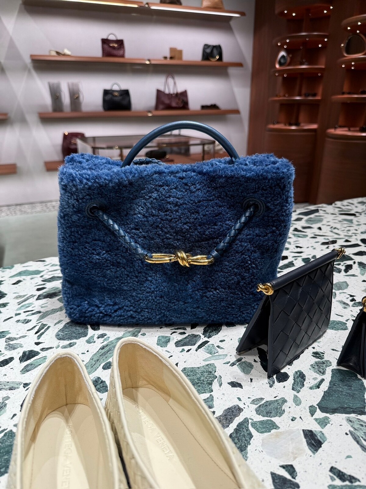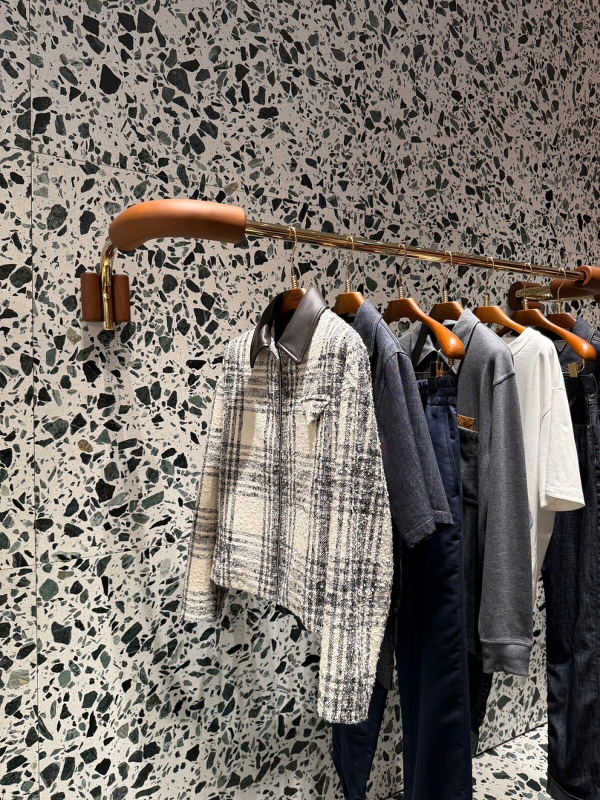 走進全新的店內,Terrazzo大理石、馬賽克拼貼工藝以及溫潤色澤的胡桃木打造的整體空間,在這其中也藏著Bottega Veneta對於台南專門店的巧思, Terrazzo大理石與台南老屋中常見的磨石子地有著類似的風格,透過灰藍、卡拉白、阿爾卑斯綠與卡尼科灰等天然石材交織出的色調,彷彿一秒來到威尼斯。