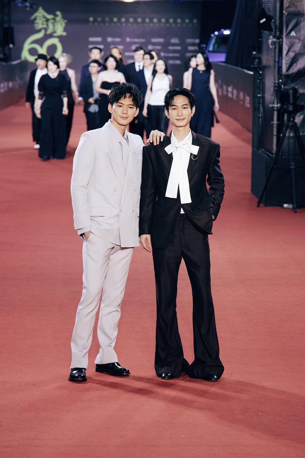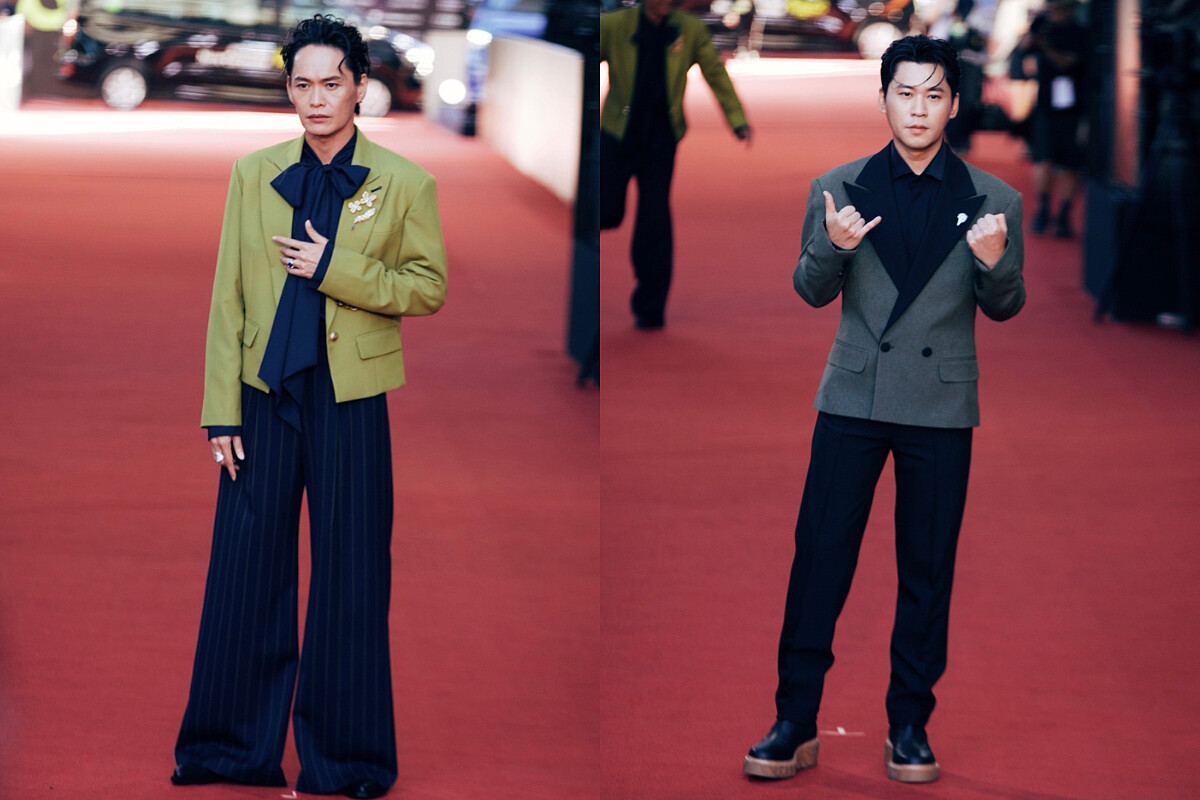 吳念軒、黃河兩人以截然不同的風格亮相紅毯,吳念軒的低飽和奶茶色套裝,帶來全身統一的完整性,帶來乾淨舒爽的氛圍;黃河的黑色西裝造型則是復古的喇叭褲輪廓,配上華麗感的蝴蝶領結、Christian Louboutin尖頭靴款,駕馭起來游刃有餘。