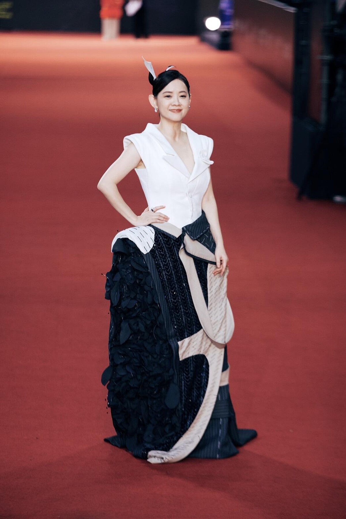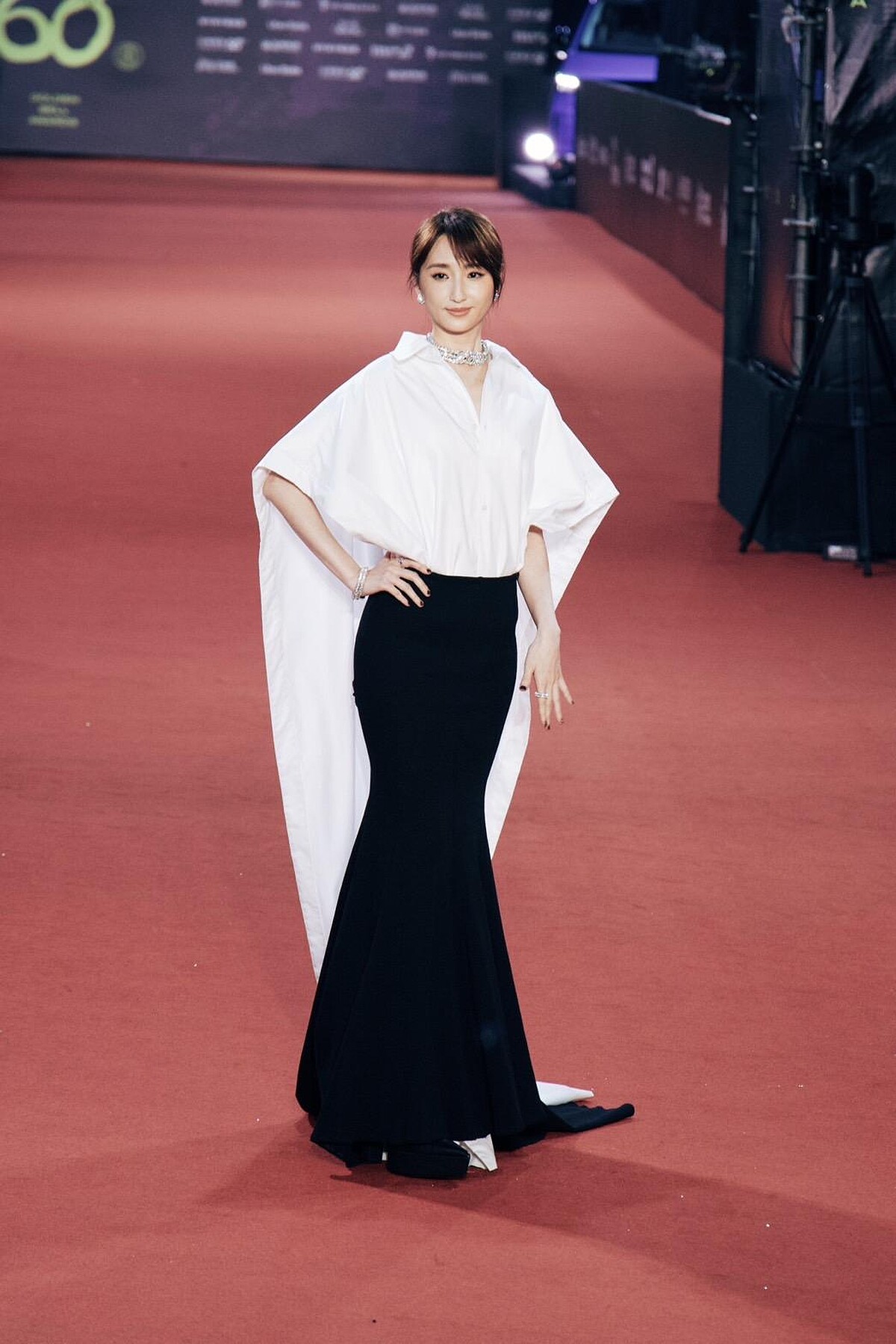 柯佳嬿以斗篷式襯衫搭配沙漏形長裙,黑白撞色的禮服造型與獨特剪裁,特別襯托她脫俗的氣質,寶格麗珠寶的加持下則更添莊重高級氛圍。