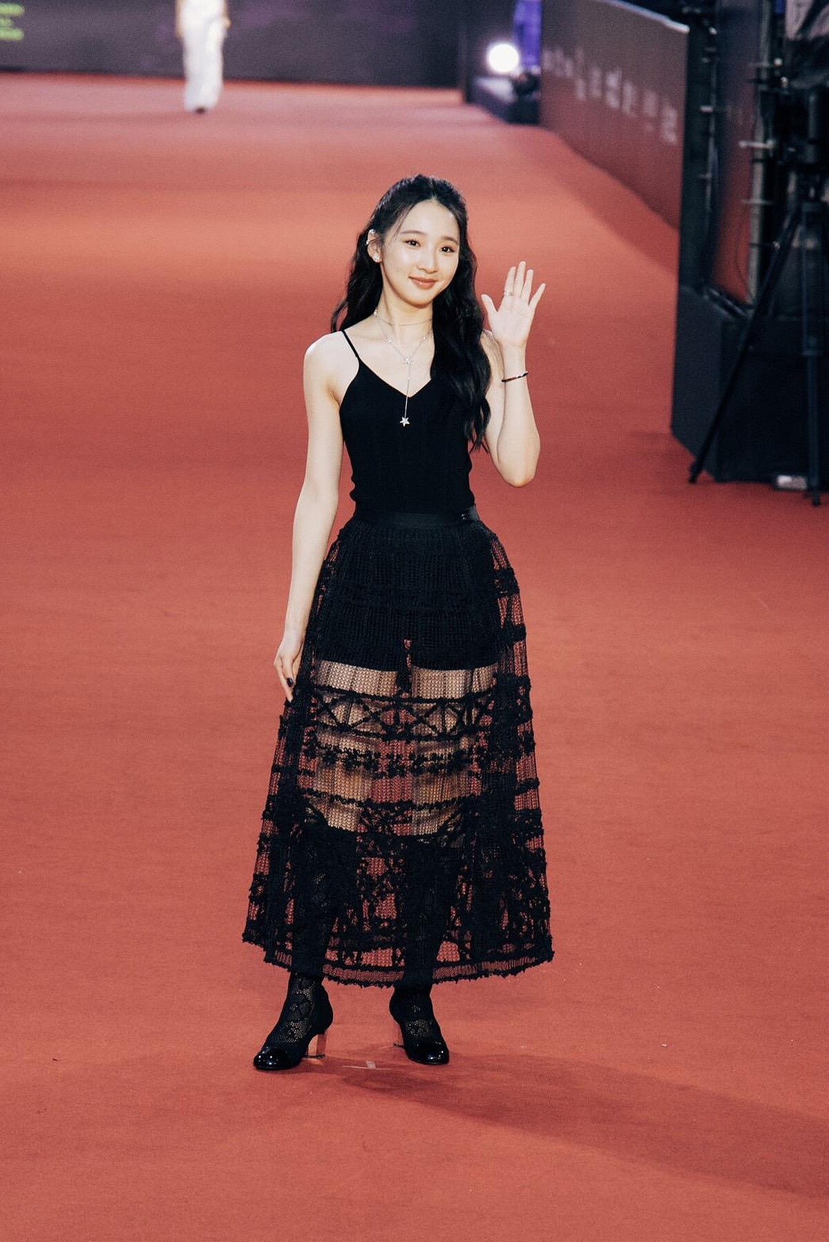 李沐於紅毯選擇了Chanel黑色的蕾絲長裙造型,裙襬部分呈現浪漫唯美的透視效果,完美融合少女與優雅的氣息,讓李沐化身Chanel小公主。