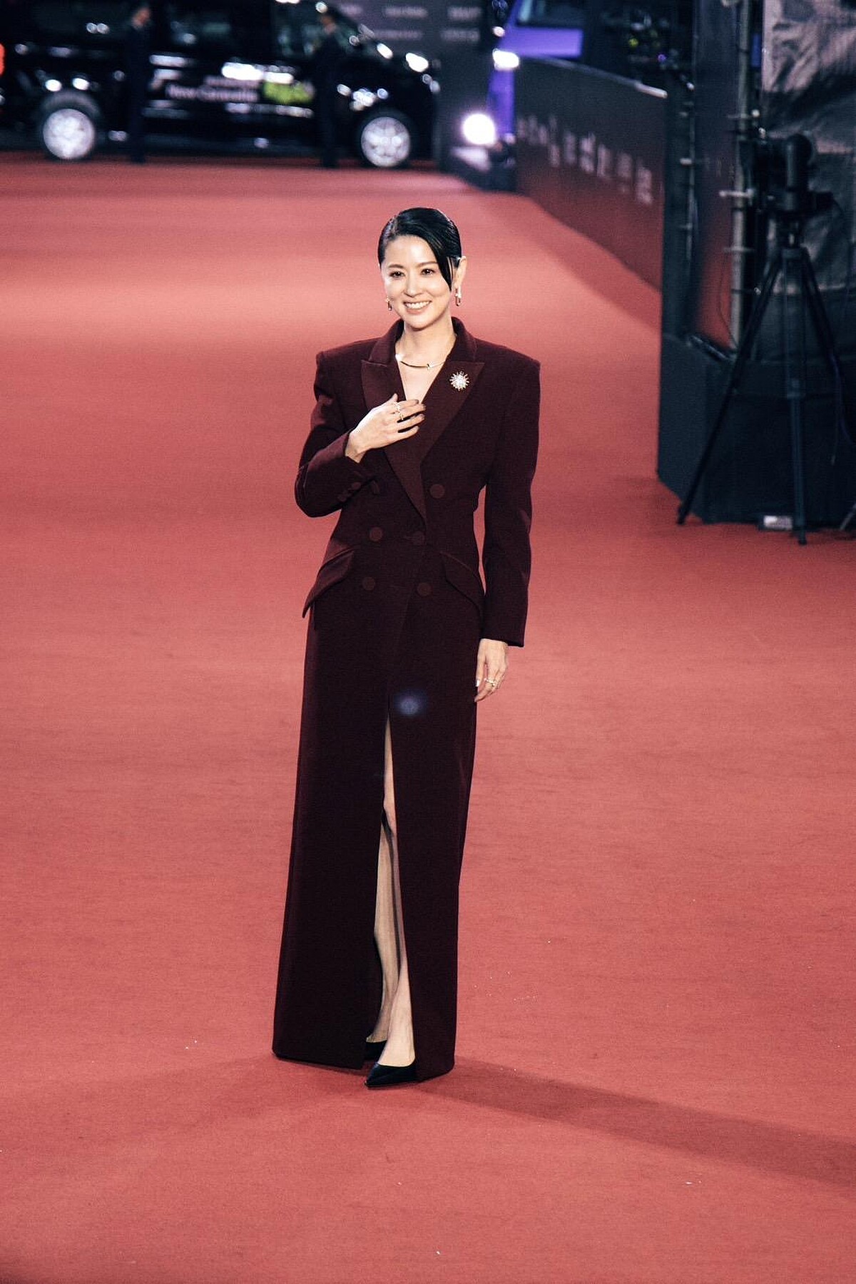 林予晞今晚穿著紫紅色的拖地長版大衣作為晚裝造型,搭配Christian Louboutin的尖頭高跟鞋,中性風格之中仍利用腰線凸顯出女性曲線,展現出她獨特的帥美魅力!
