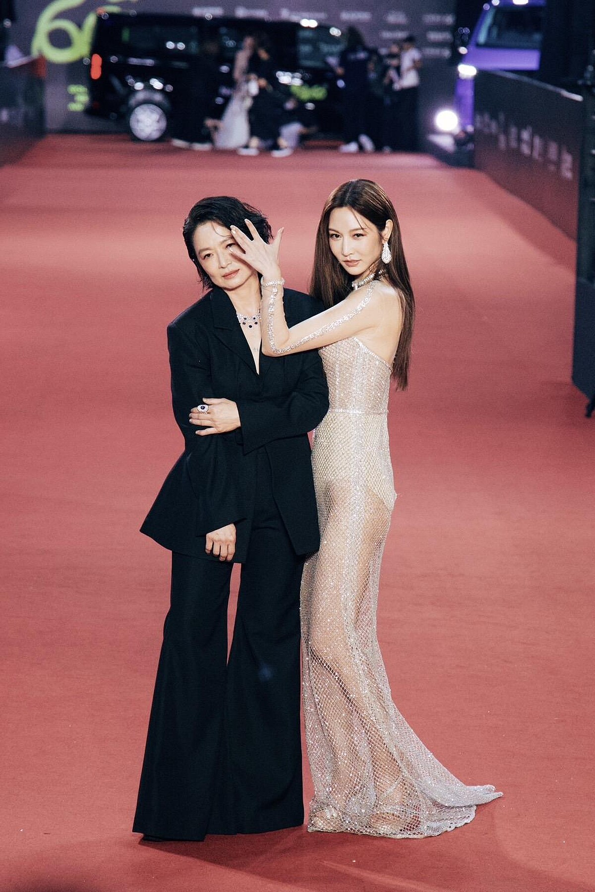 謝瓊煖以中性風格的黑色褲裝亮相,浮誇的A字衣襬和闊腿版型相得益彰,配上微濕髮造型,非常有個性!而謝瓊煖與曾莞婷雙雙入圍本屆最佳女配角,兩人在紅毯上的互動也特別吸睛、可愛!
