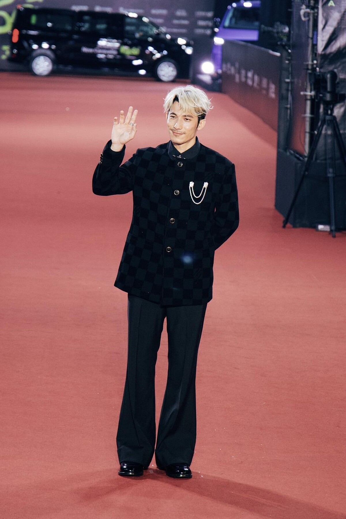 憑藉《化外之醫》角逐本屆最佳男主角的連炳發,穿著Louis Vuitton 最新2026春夏系列的Damier 棋盤格植絨無領晚宴西裝,並佩戴Louis Vuitton 頂級珠寶系列胸針、戒指,整身行頭相當精彩。