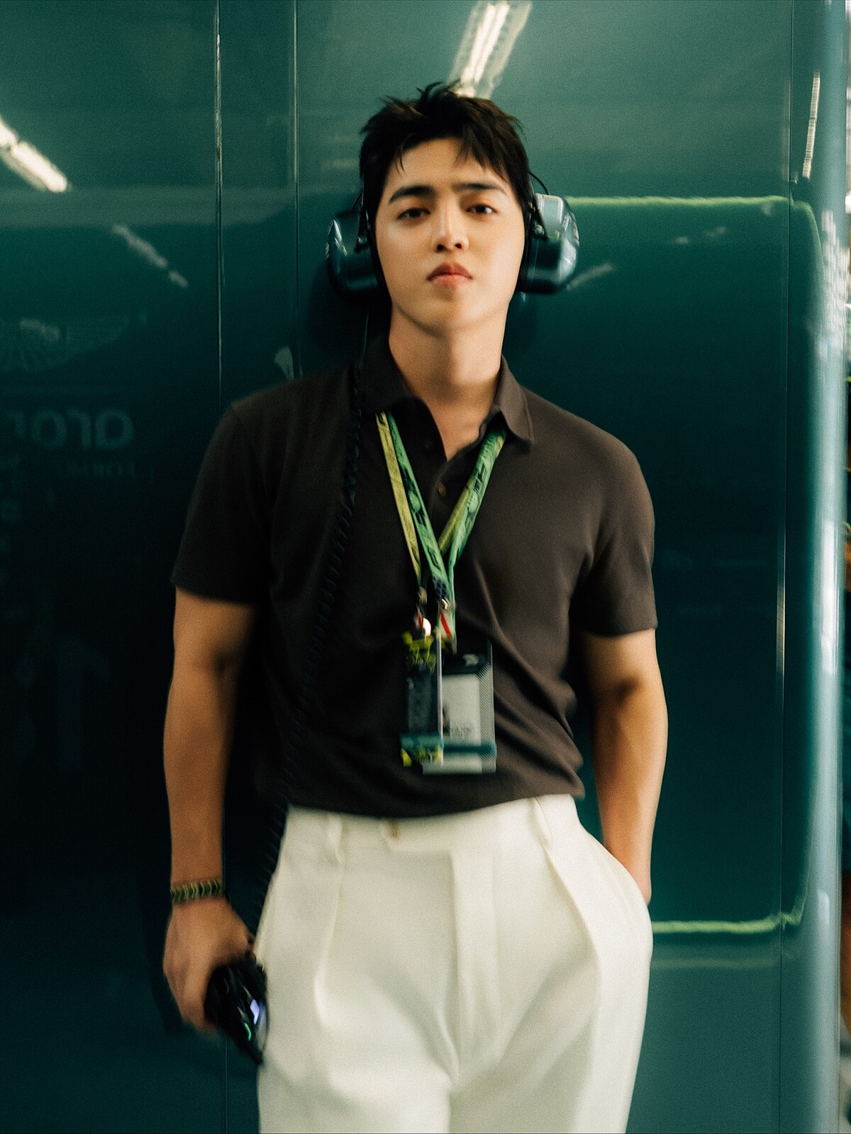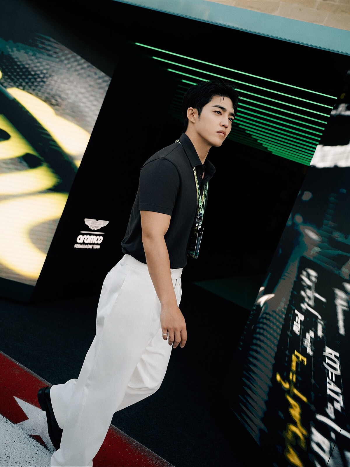 他身穿深色 Polo 衫搭配白色寬版長褲的造型亮相,將俐落線條與沉穩氣場完美呈現。