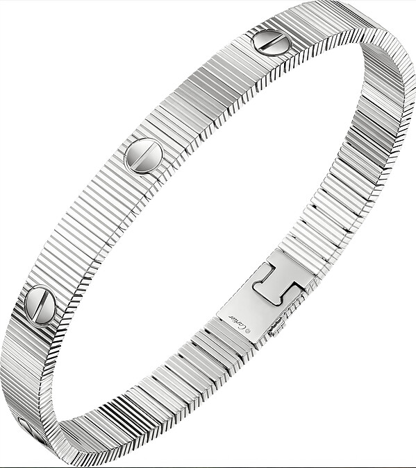 LOVE Unlimited白K金手環 白K金。 精美「GADROON」紋飾,加強光影折射,展現珍貴質感,搭配新款扣環,無須使用螺絲起子,重量約29.72公克,尺寸14-23。 參考價格約NT$ 325,000。