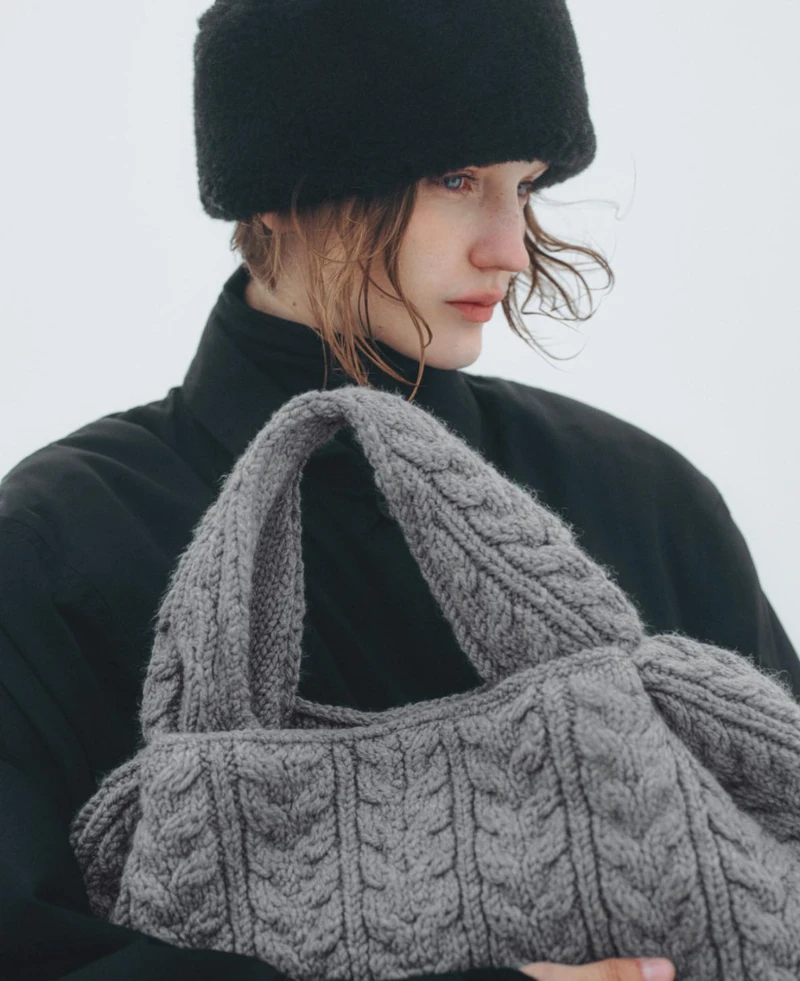 總共帶來駝色、灰色與深棕色三種色調,Cyme包型於肩背帶、兩側飾帶保留了皮革質感,上方拼接不同的編織紋理;Number Nine則全以麻花針織面料包覆,提供Mini與Large的尺寸選擇。
