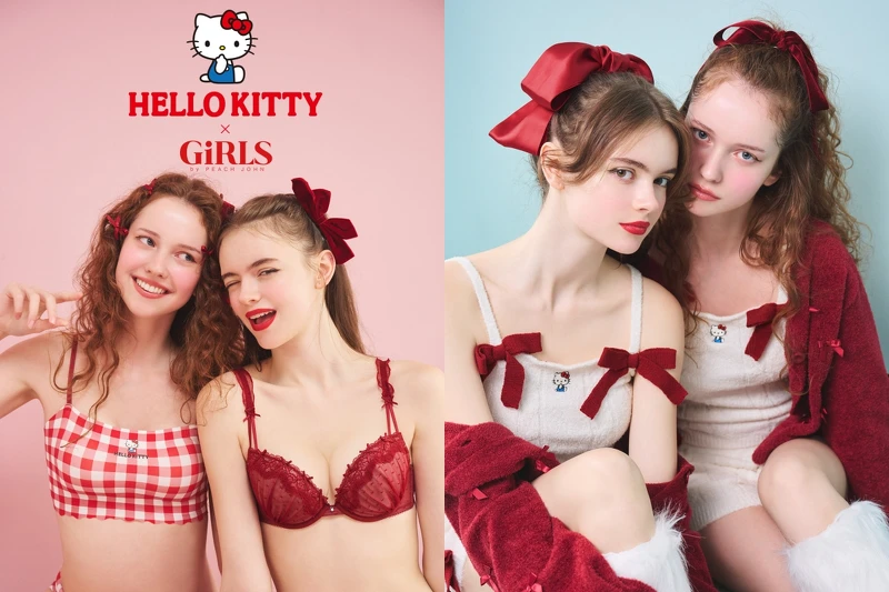 PEACH JOHN姊妹品牌「GiRLS by PEACH JOHN」也推出Hello Kitty限定系列,將復古浪漫與性感融合成少女感的日常單品,經典紅色蝴蝶結元素貫穿全系列,舒適又不失可愛,編輯最推薦的是編織蝴蝶結背心短褲睡衣套裝,正面兩個大大的絨面蝴蝶結裝飾,在家或外出穿著都非常討喜!聯名系列已於10月22日起於PEACH JOHN官網與全台門市正式開賣。
