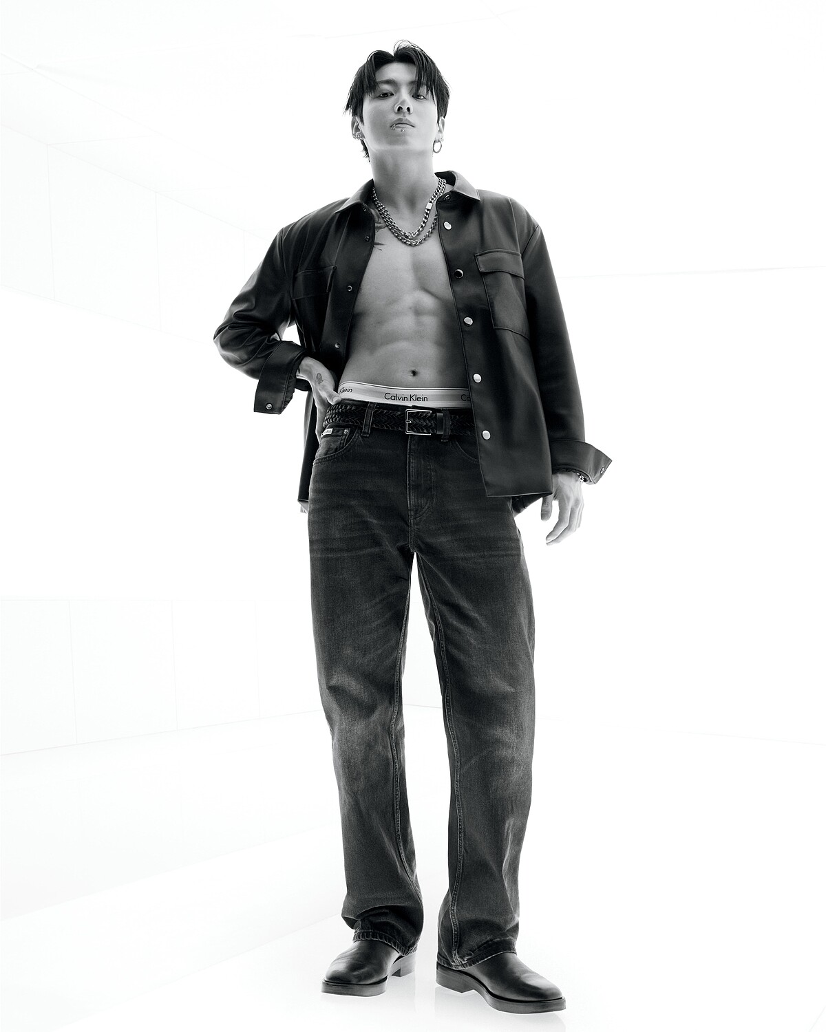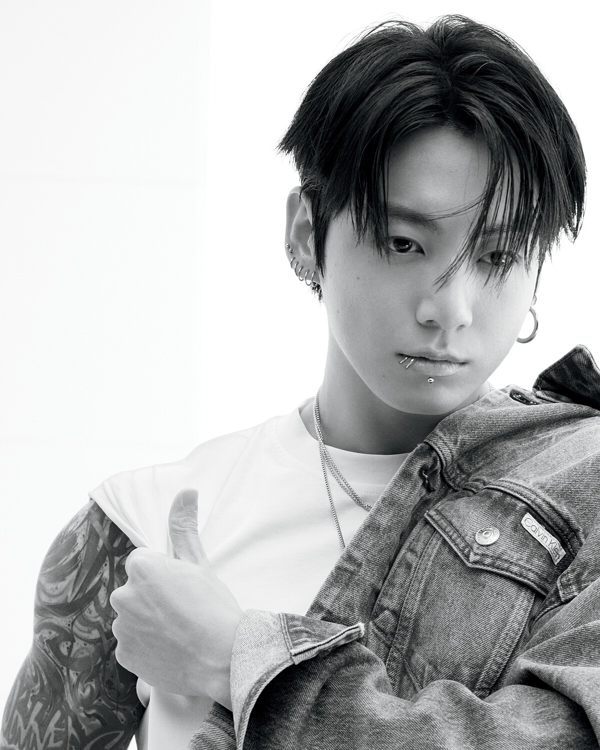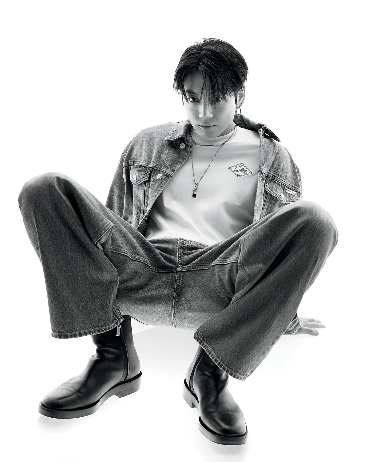 在此次形象系列中,Jung Kook 身著多套全新季節造型:包括標誌性的全丹寧套裝、飾有羊毛滾邊的皮革外套,以及結合工裝風格的縫褶木匠牛仔褲與外套。