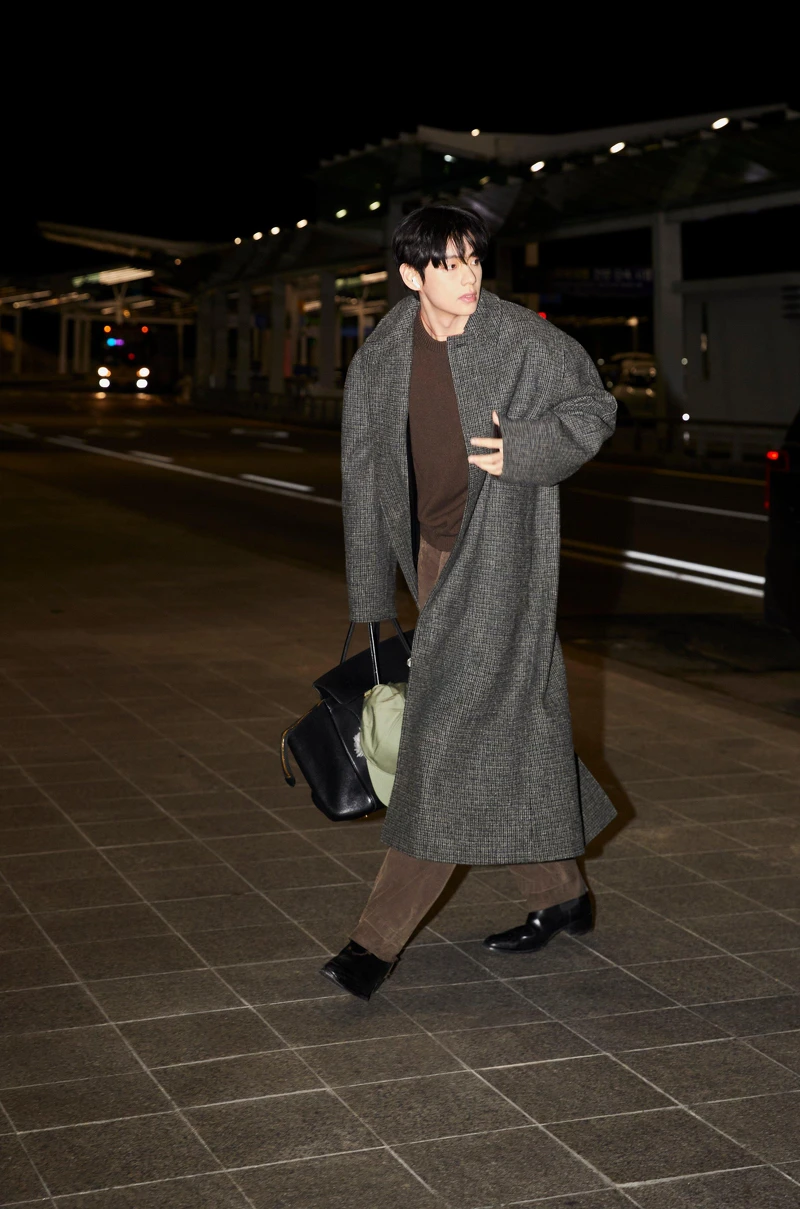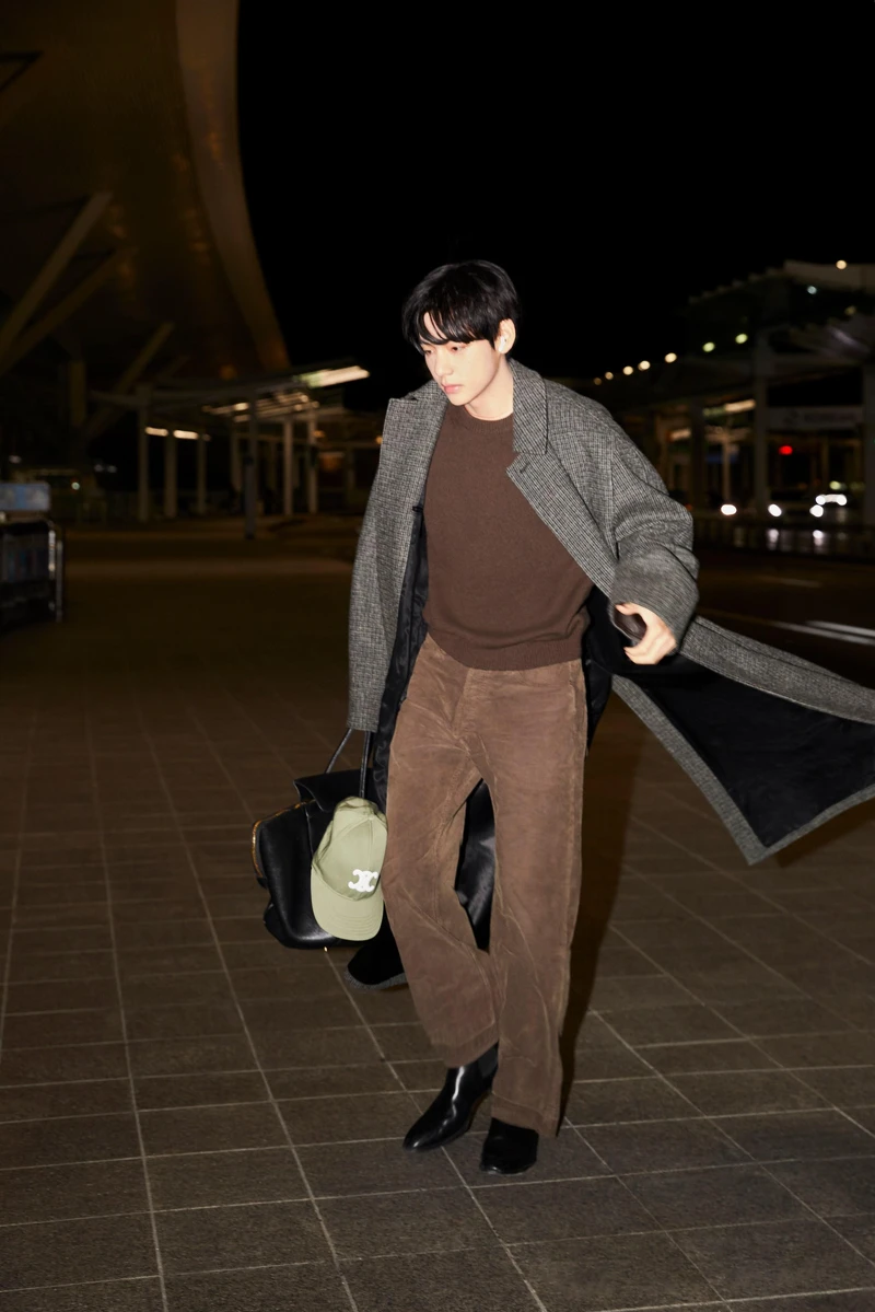 V 身著深棕色針織上衣搭配同色系燈心絨長褲,以細膩觸感與柔和色階堆疊秋冬氛圍,展現 CELINE 所擅長的簡約輪廓與低調奢華。外搭灰調長版大衣,乾淨俐落的線條延伸出修長比例,勾勒出從容而不張揚的姿態。色調上,整體以棕與灰的冷暖交融構築視覺平衡,散發出男性氣質中帶有詩意溫度的質感魅力~
