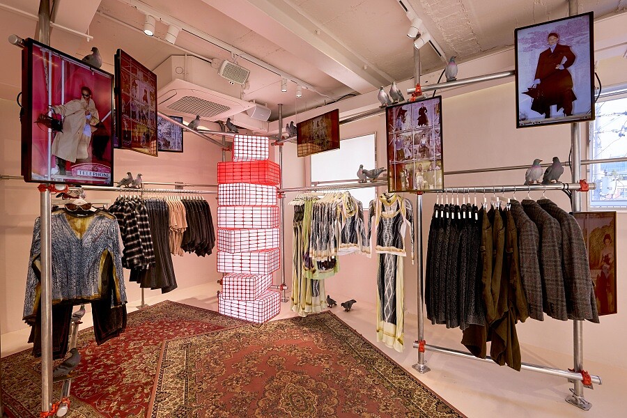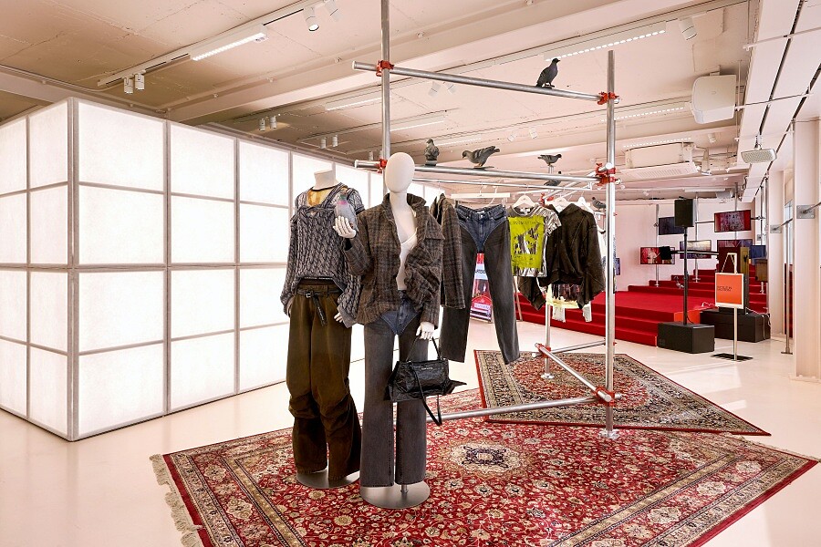 與Glenn Martens的聯名系列於概念店的三樓展開,明亮又搶眼的紅色系空建中,Glenn Martens標誌性的結構感丹寧、再構風衣、印花禮服與雕塑式針織陳列其中,多個螢幕播放這次的時尚家族形象大片,不僅放大了設計師的個人特色,在氣氛的襯托之下,也更能完整感受到這次系列的單品調性。