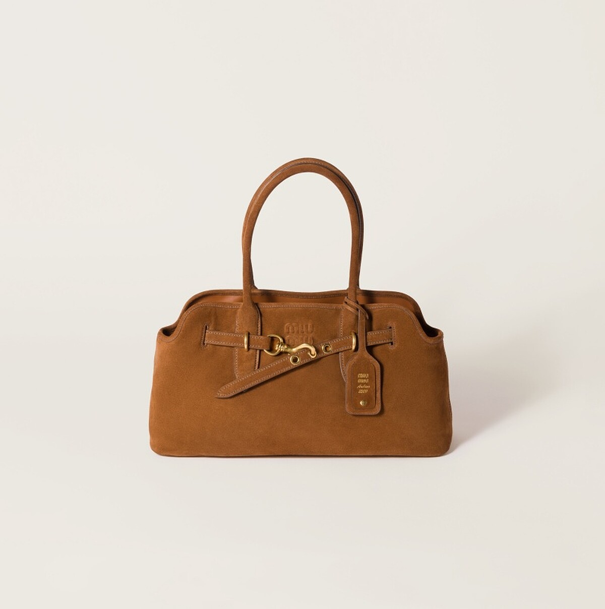 Miu Miu以復古馬術元素結合麂皮質感,打造出兼具知性與俐落的手提包。光滑的駝色麂皮搭配金屬馬銜釦細節,散發學院氣息與摩登感。包身比例修長、線條簡潔,無論搭配針織開襟衫或翻領外套,都能展現溫柔與力量並存的秋冬氣場。
