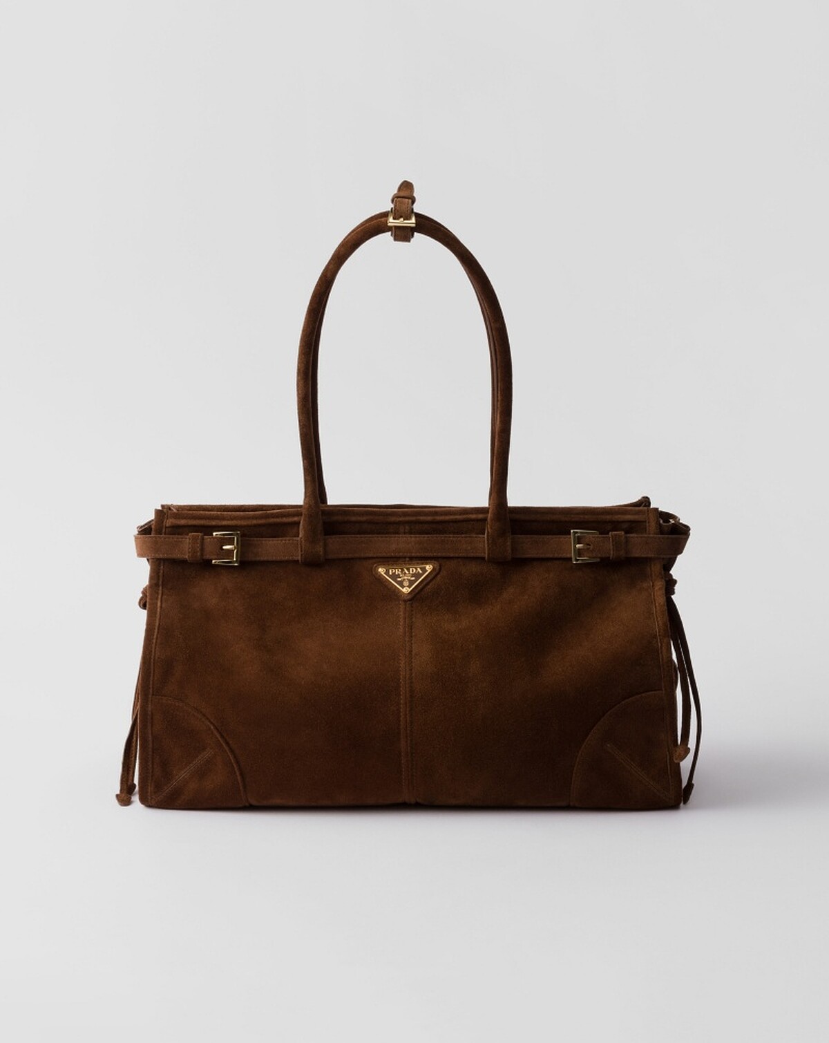 PRADA洗版時尚穿搭博主的熱門包款之一,Bonnie在秋冬也換上焦糖色的麂皮風格,美拉德深咖色的包身結合三角標誌與皮帶裝飾細節,低調中帶有復古氣息。