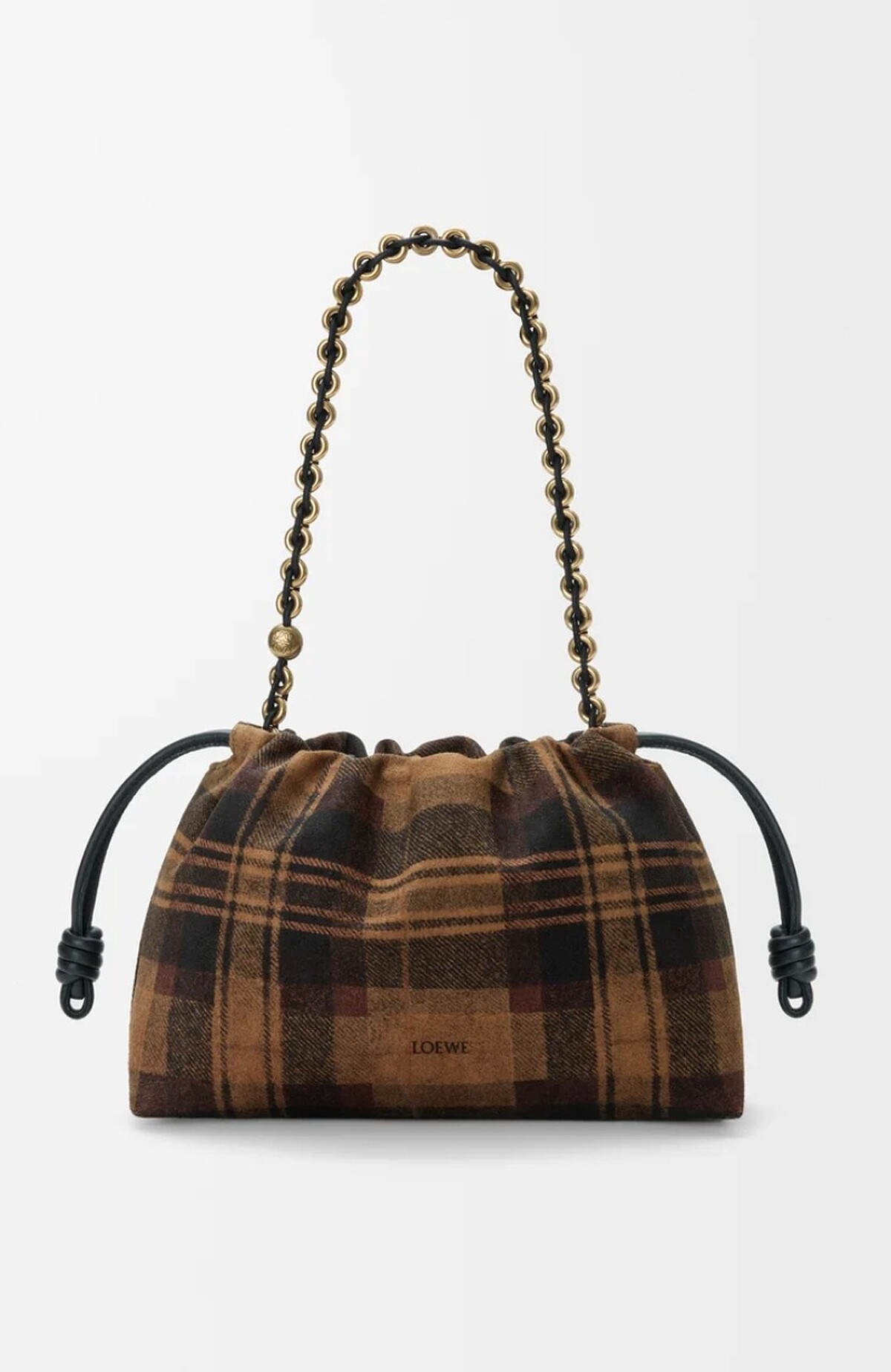 與格紋結合展現麂皮在秋冬的全新姿態,柔軟束口設計展現品牌一貫的工藝細節,焦糖與黑褐色的搭配讓秋日氣息更加濃厚,甜甜圈金屬鍊帶更是為這款手袋加入了俏皮感。