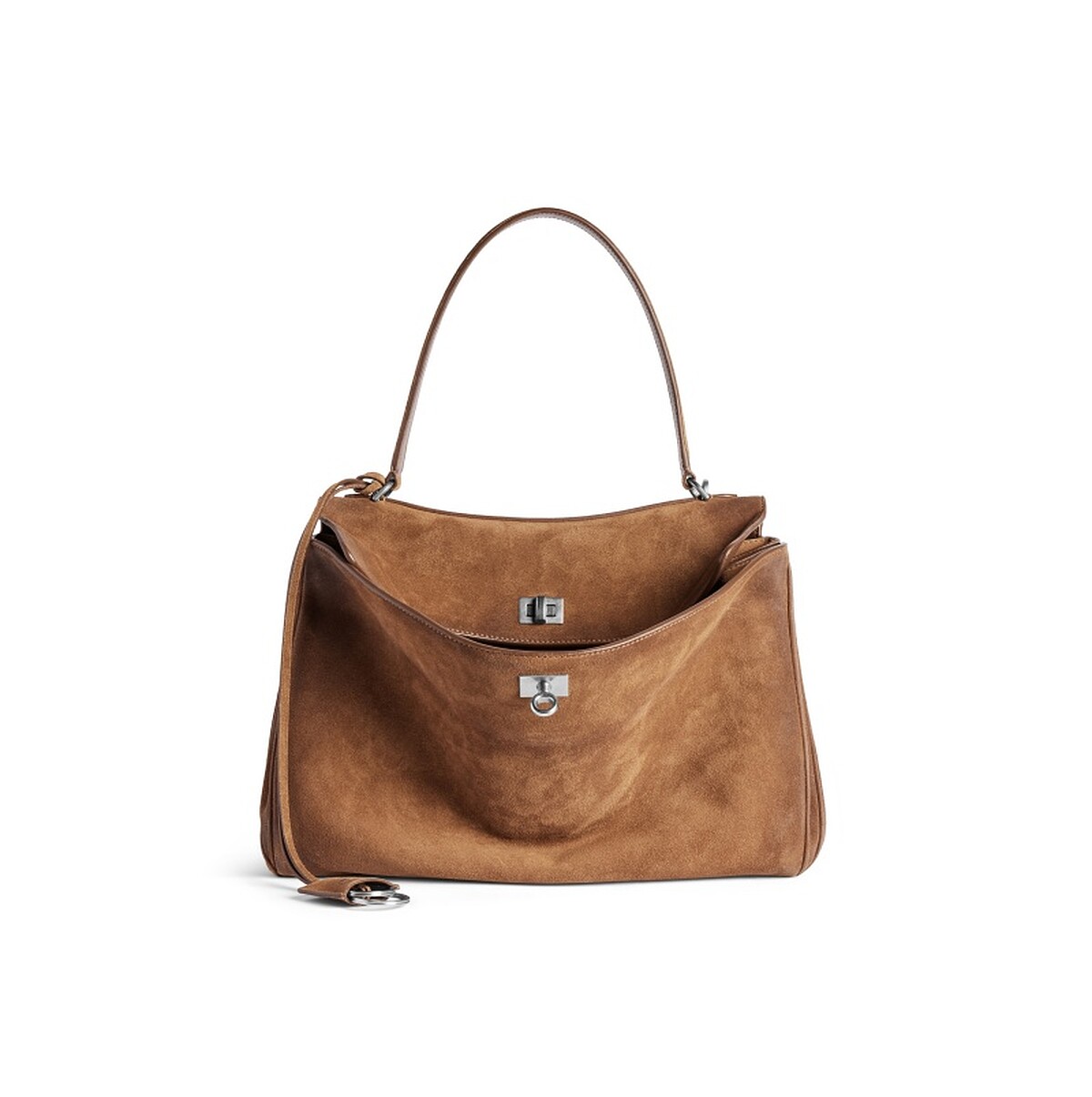 BALENCIAGA率性的Rodeo包款在換上麂皮材質之後,駝棕色絨面讓包款俐落帥氣的個性感柔軟不少,在搭配上無論是休閒的牛仔褲,或是帶有一點女人味的裙裝也都很適合!
