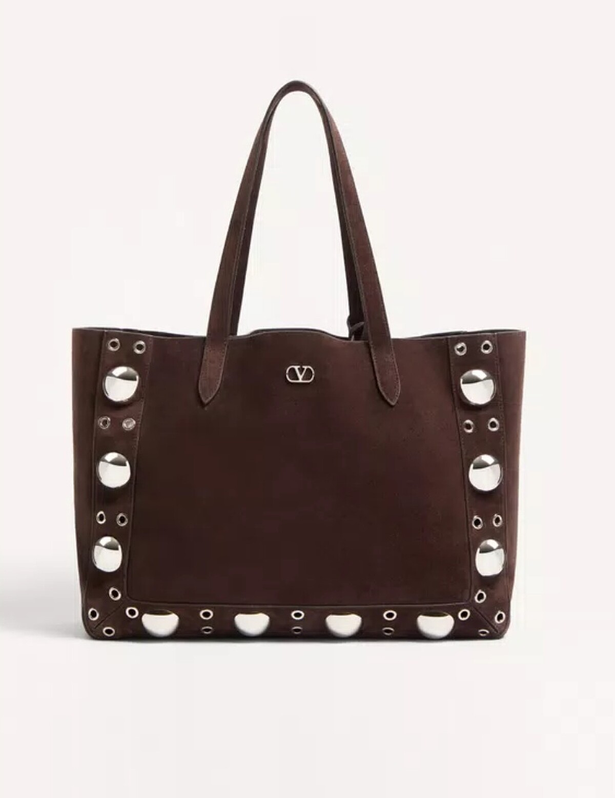 VALENTINO把麂皮玩出不一樣的新鮮面貌,深咖麂皮結合大型銀色鉚釘,展現搖滾與優雅並存的個性手袋,搭配上大尺寸的托特包型,很適合時髦又忙碌的都會女性。