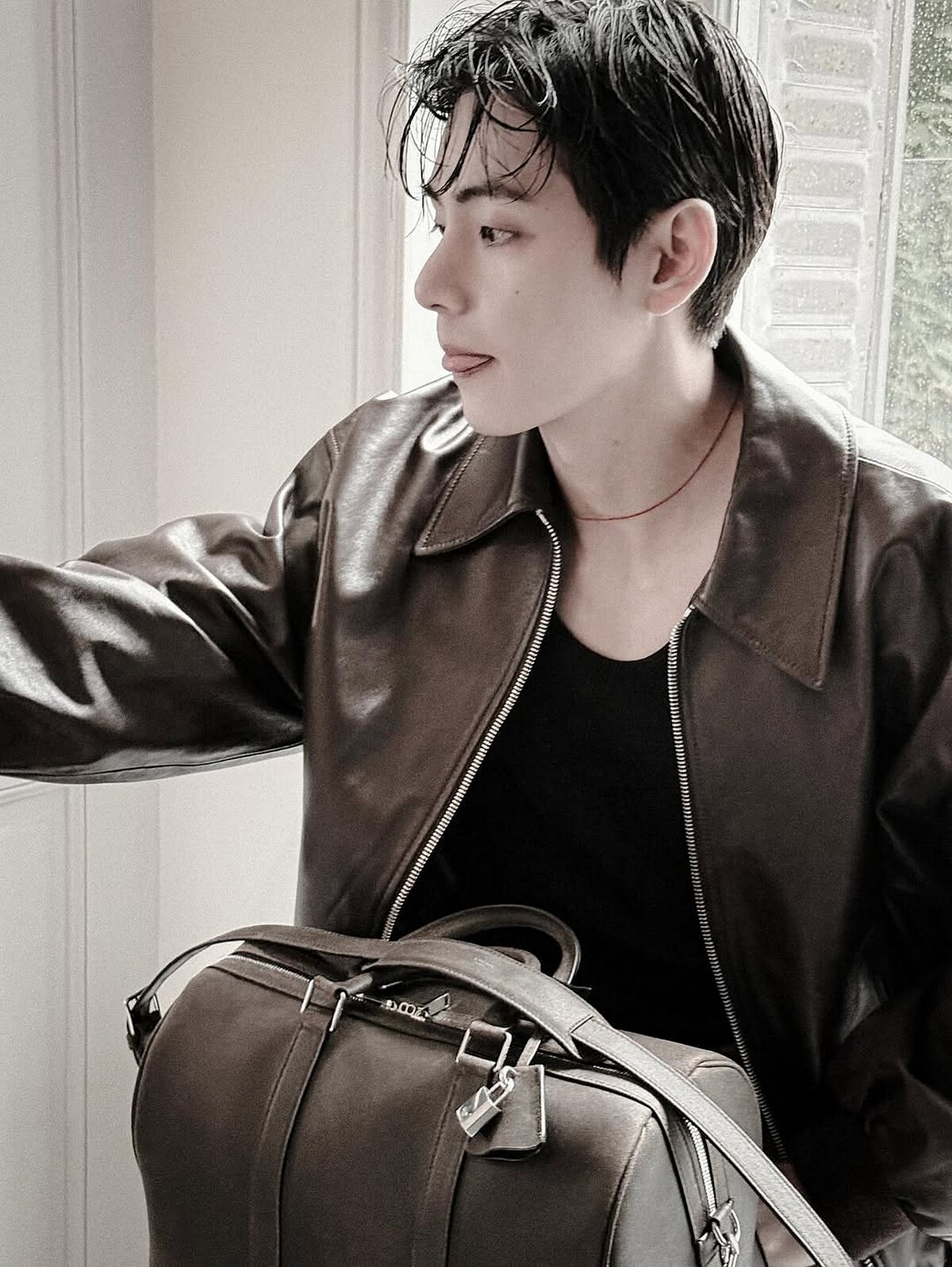 CELINE 全球品牌大使 V(金泰亨)與朴寶劍在此次形象中展現截然不同的行旅面貌,為系列注入更多層次。V 以深棕皮革外套搭配同色系長褲,俐落的廓形與霧面皮革相互呼應,展現冷靜而帶點叛逆的都會氣息。