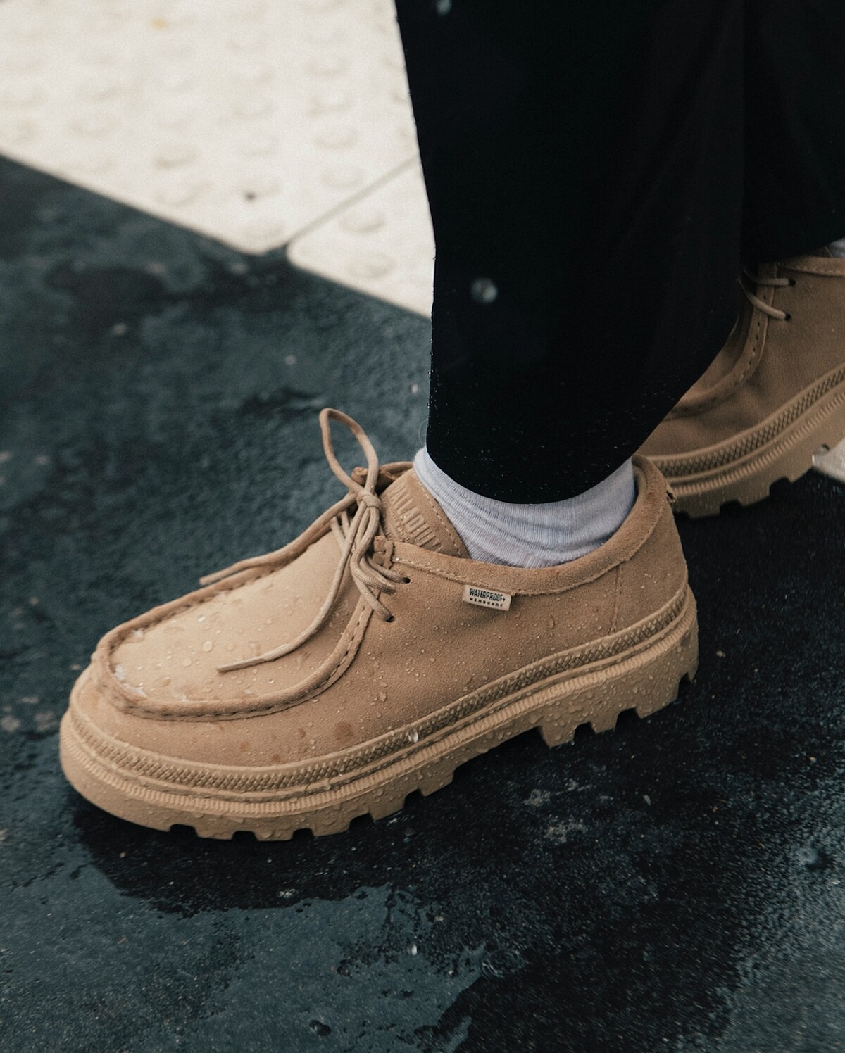 PALLADIUM將品牌經典軍靴的防水技術融入樂福鞋,新推出的TROOPER LOAF是一雙既有氣質又具機能的鞋款,鞋面選用防潑水麂皮材質,內襯搭載WP+ 防水結構,腳底則配置橡膠防滑大底,鞋型線條帶點厚底比例,實際上腳更有份量但不笨重,從裙裝到寬褲都能搭出時髦風格。