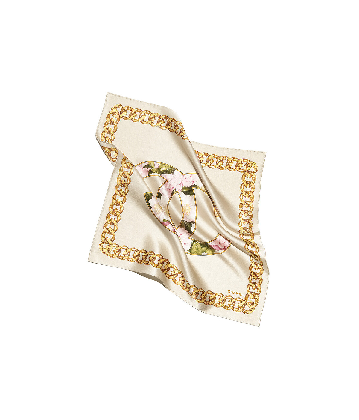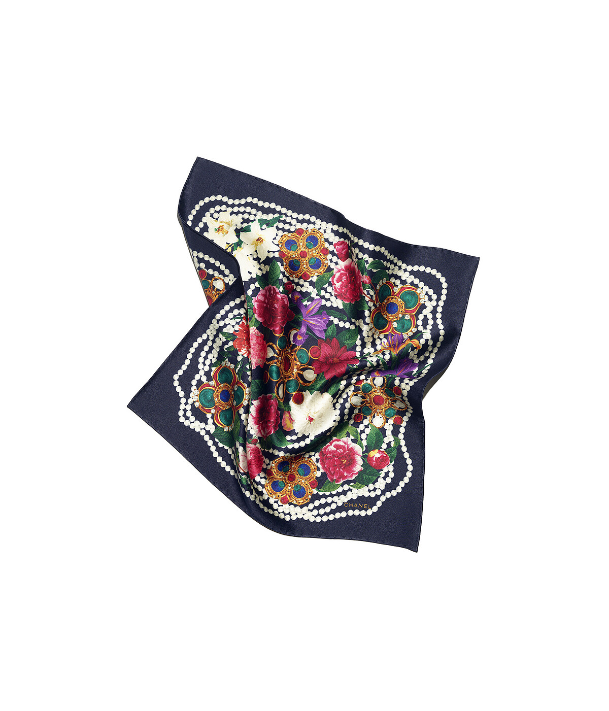 Chanel多彩飾以山茶花與幻象珍珠圖樣方巾,