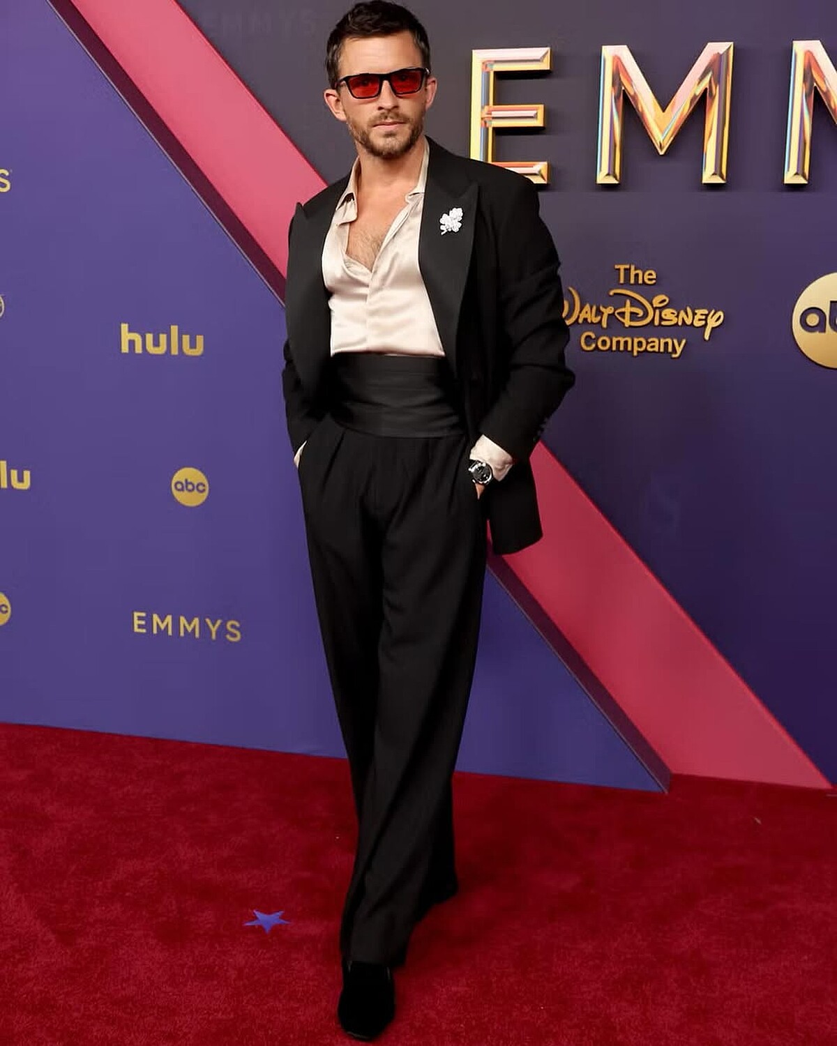 在艾美獎紅毯上,Jonathan Bailey身穿黑色西裝搭配香檳色緞面襯衫,比起一般的白襯衫,更顯出高貴氣質,往下開兩顆鈕扣的開襟造型,讓脖子線條順勢延伸到胸際,避免脖子看起來太過粗短、優化頭身比例。在腰際選擇搭配腰封,則另一方面拉長腿部比例,整體造型帶出舊好萊塢巨星氣場。