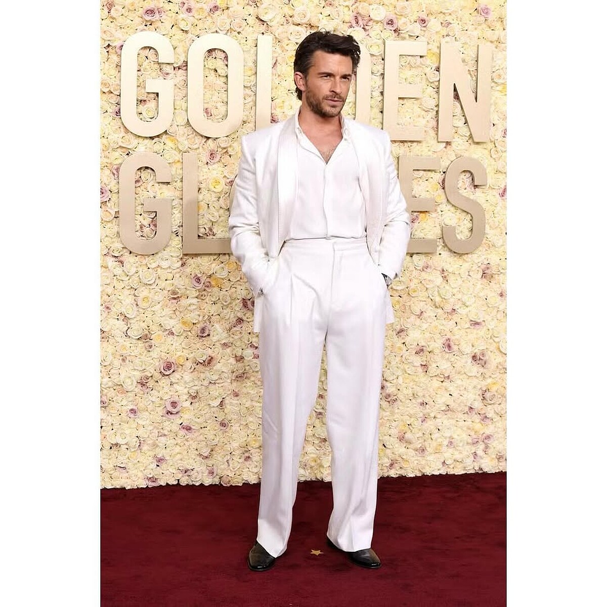 Jonathan Bailey在去年金球獎上化身真人版白馬王子,穿上Givenchy全白西裝,肩線筆挺、線條俐落,不打領結、增加露膚度的開襟造型,讓全白Look的拘謹度減低,緞面領片設計也在視覺上多一分層次感,不顯得單調,完美詮釋現代瀟灑版白馬王子。