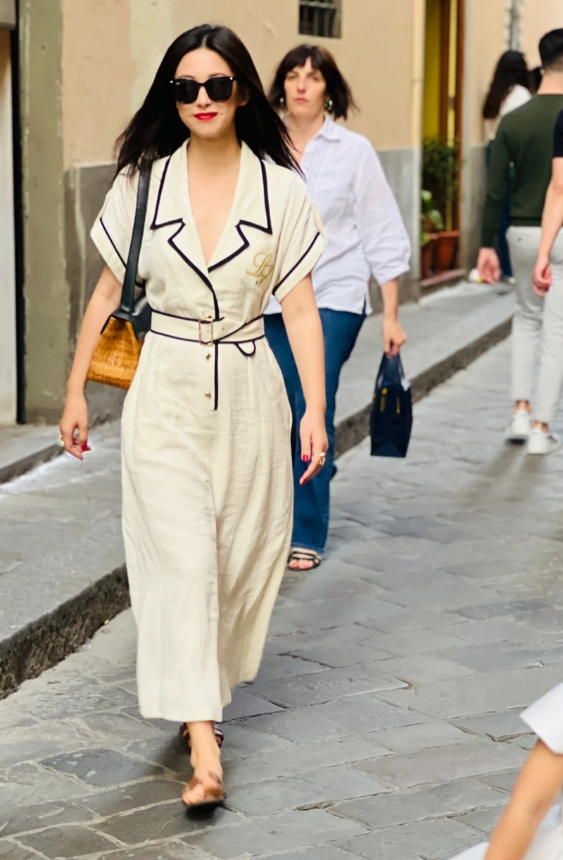 朱珠在歐洲街拍的這套米白連身裙,有著襯衫式大領片、黑色滾邊與輕鬆的腰帶線條撐起好比例,與亞麻材質相呼應的重點是搭配藤編包,不會太正式,也可以強調輕鬆的度假感。