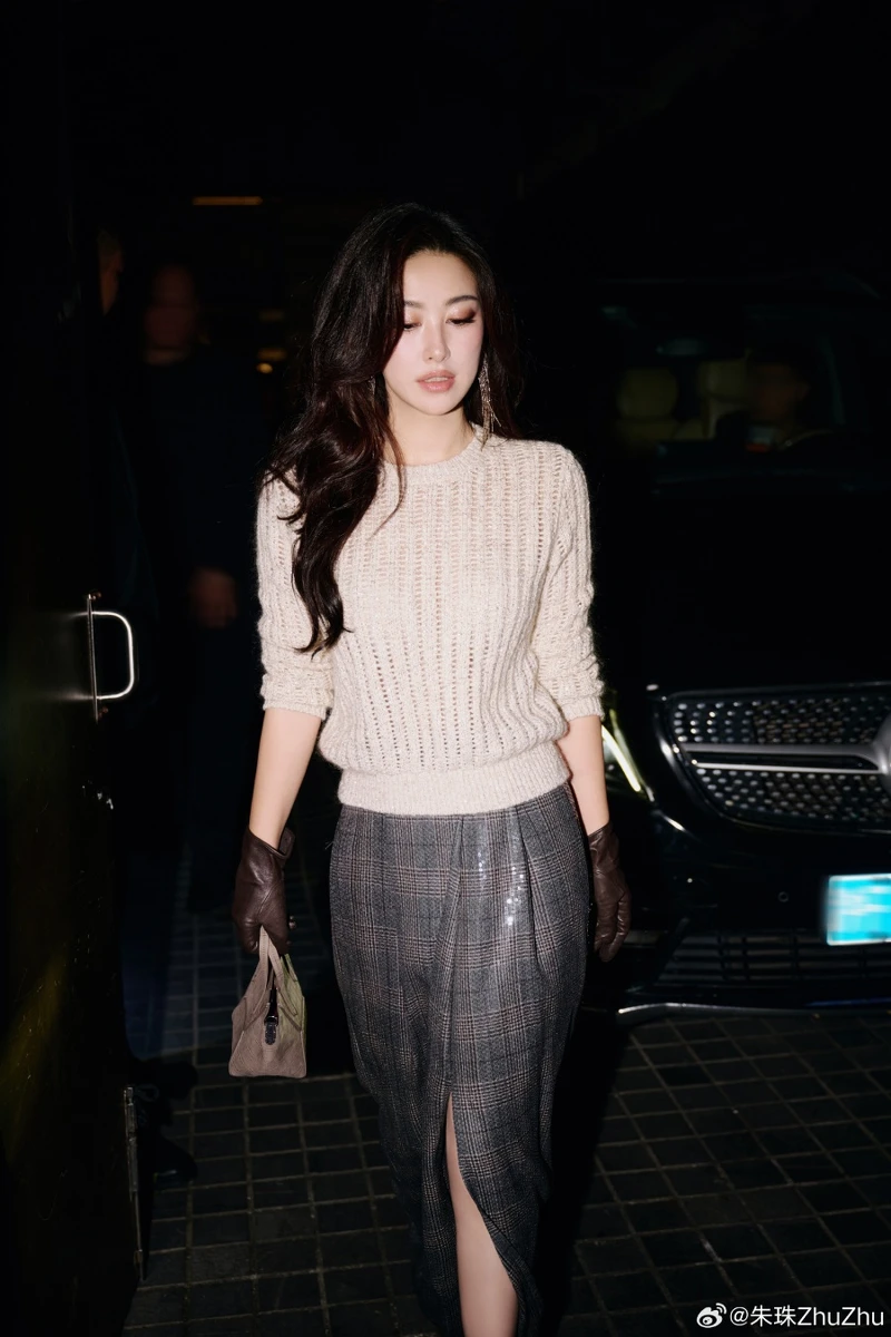 亮片也能穿得很有氣質!朱珠這套造型將亮片藏在格紋裡,搭配上奶油色針織毛衣,剛剛好的閃度、非常適合晚餐或半正式活動,加上皮手套氣場大加分。