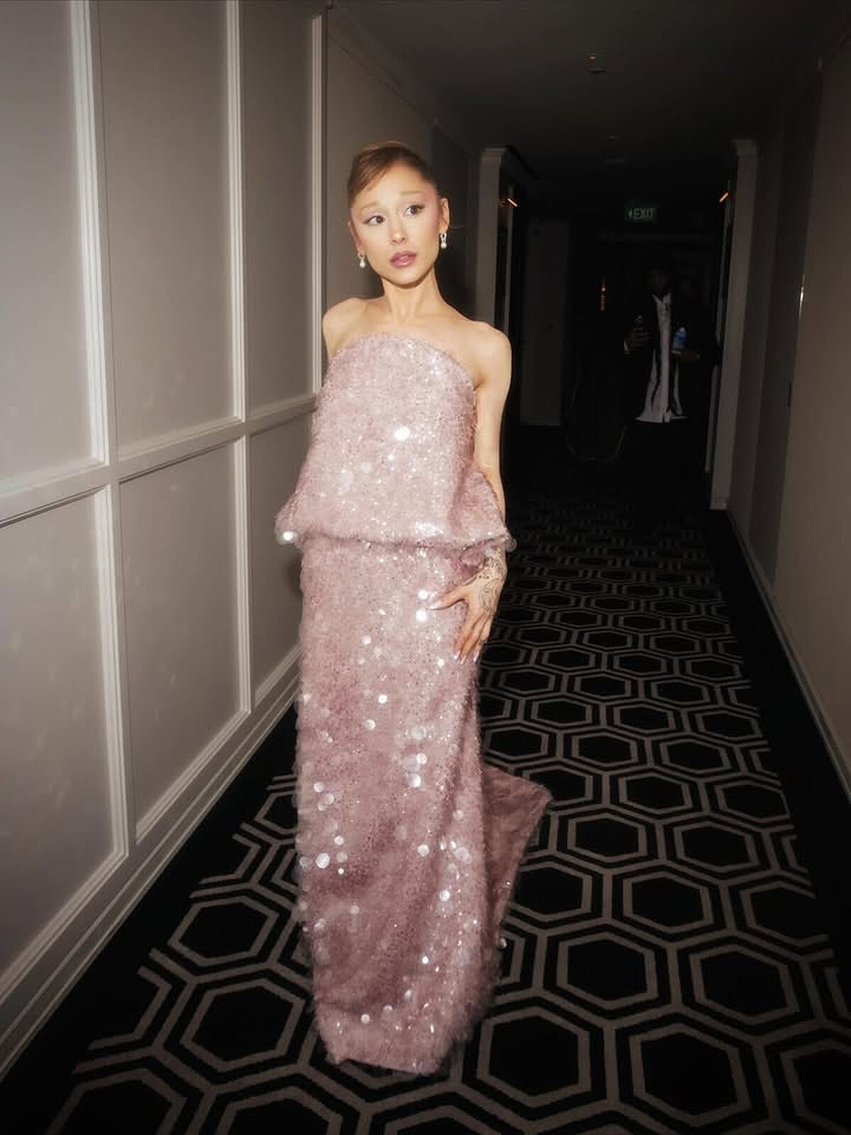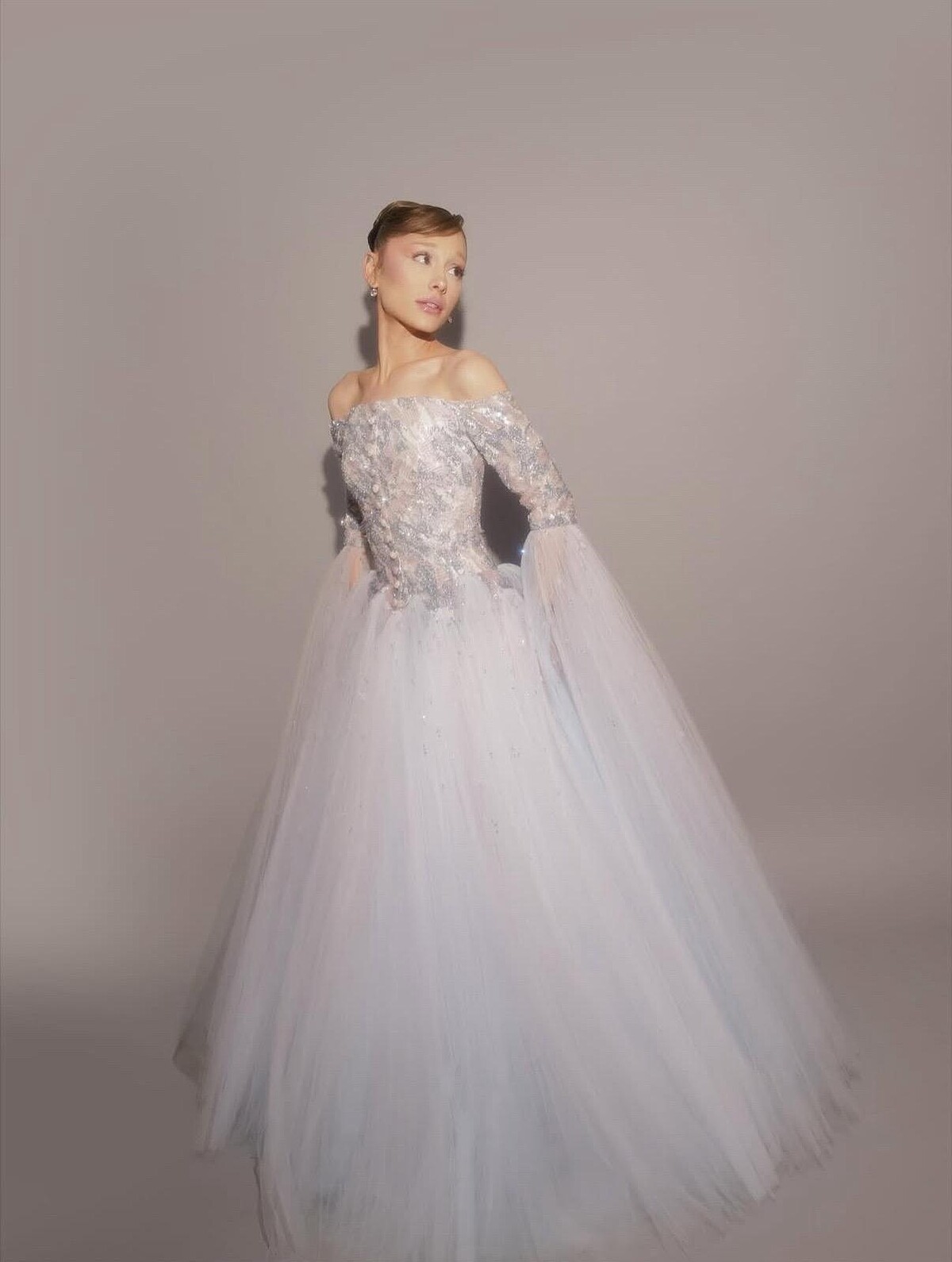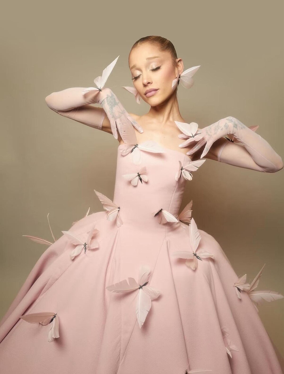 Balenciaga泡泡粉色亮片禮服完美襯托出Ariana Grande的角色特質,大小錯綜的閃亮反光,呈現出童話中的不真實美感,且此為Balenciaga新任設計師Pieraaolo Piccioli 操刀、特別訂製而成。