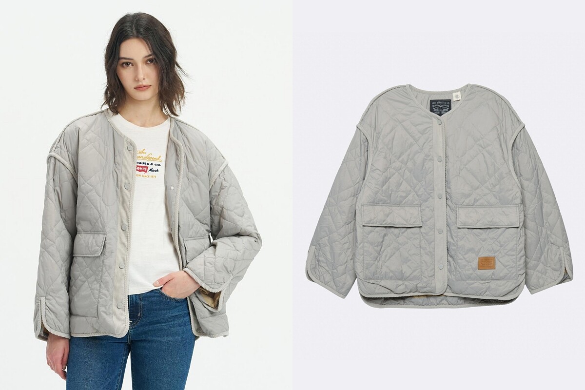 Levi’s除了丹寧之外,羽絨外套也非常有特色,以輕盈填充與可收納設計為亮點,外層防潑水、內裡保暖,同時具有都市休閒感,短版剪裁搭配經典Levi’s標誌,讓冬天即便穿羽絨也能保持利落比例、街頭風格自然流露。