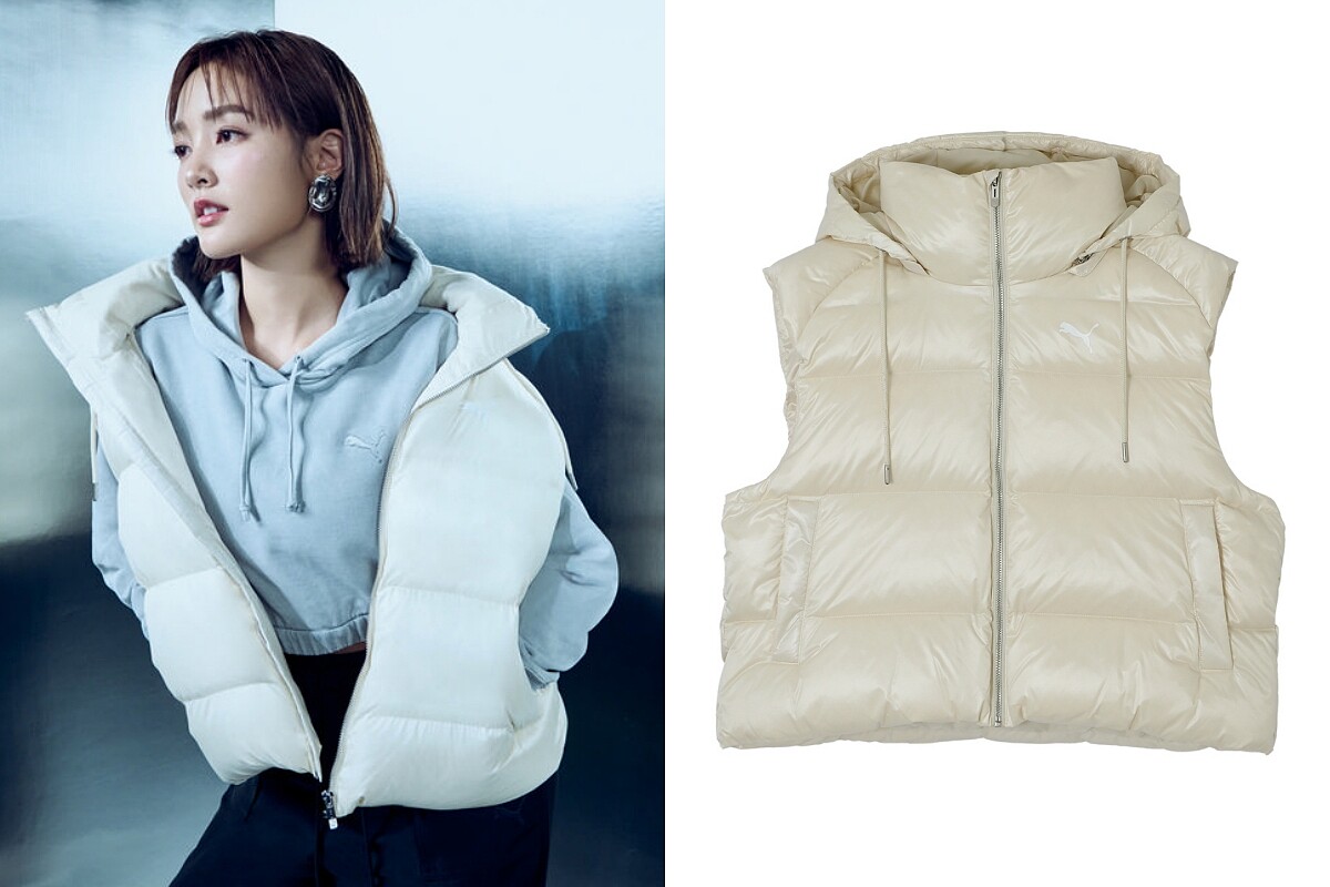 王淨同款的羽絨背心以亮面布料搭配短版剪裁,不僅為穿搭增添街頭運動風,羽絨填充讓保暖度自然升級,不太怕冷的人,可以半開拉鍊搭配內搭長袖或針織就會很足夠!