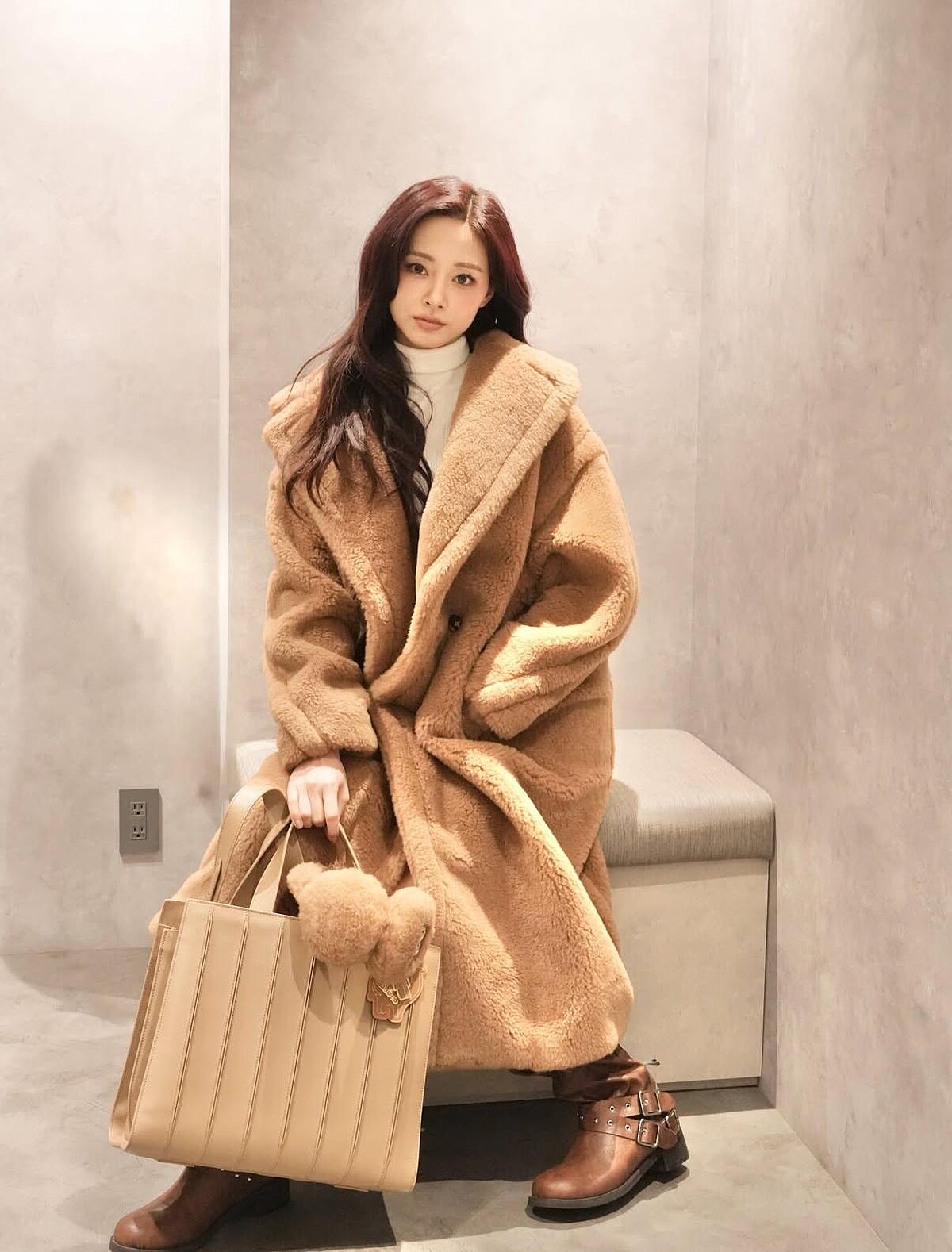 周子瑜21日抵達高雄小港機場,身上穿著Max Mara泰迪熊Teddy Bear Icon Coat系列大衣,選擇以經典的Camel駝色為機場造型營造優雅風格,內搭白色高領上衣簡單製造出層次,而手中則拎著大尺寸的Whitney Bag,作為機場包再適合不過!上頭還掛著一個小亮點——Max Mara毛毛耳罩。