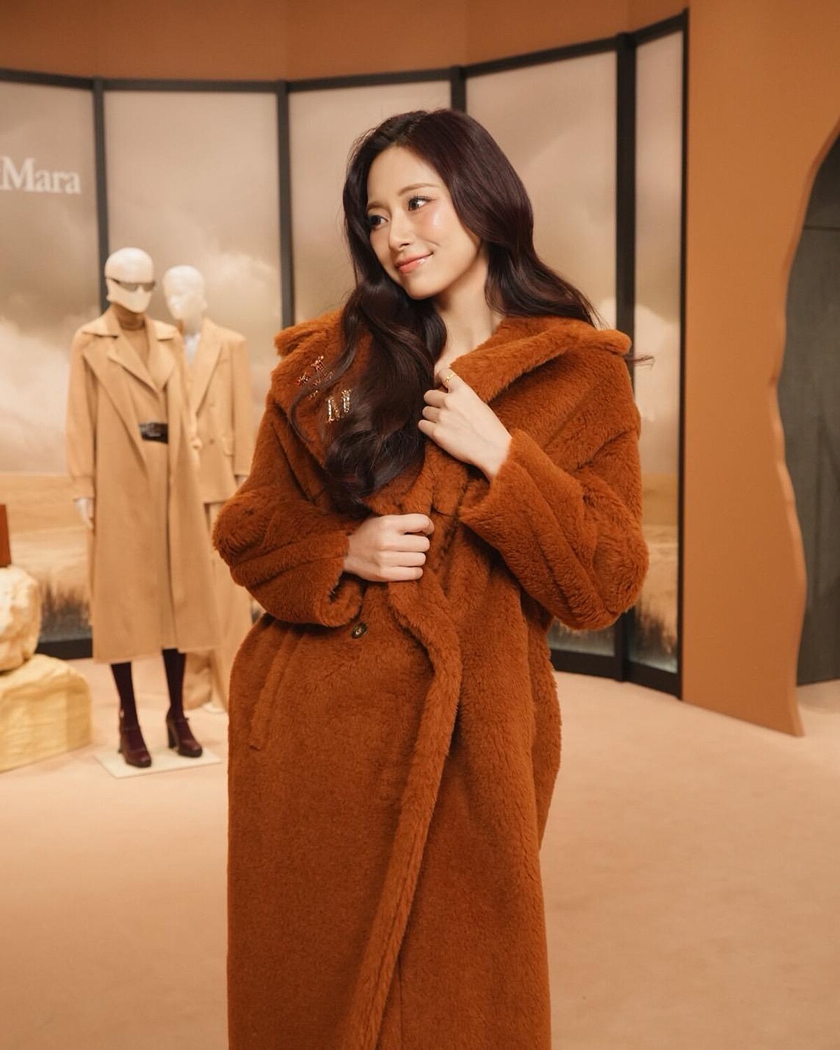 活動上周子瑜也示範另一款Max Mara經典大衣,為Tabaco顏色的泰迪熊Teddy Bear Icon Coat。